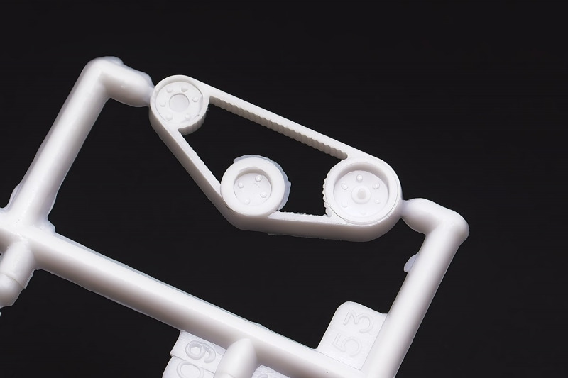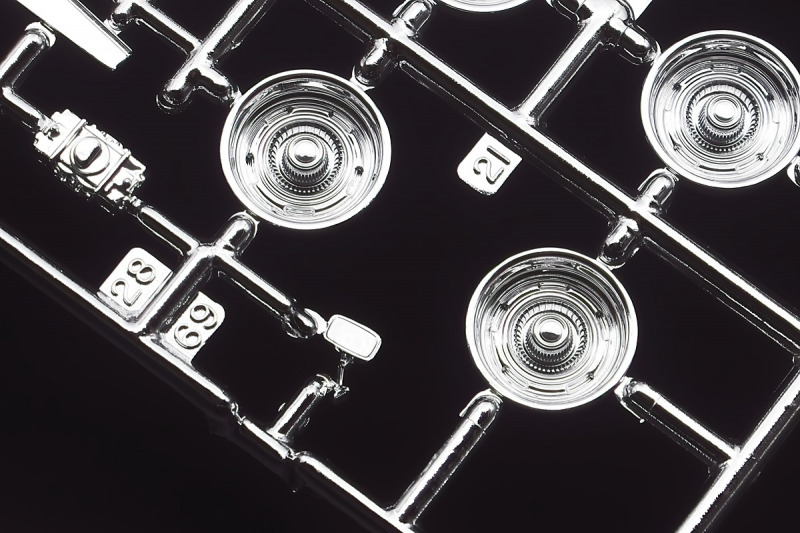 Die Räder können drehbar, aber nicht lenkbar angebaut werden. Die Reifen sind aus dem üblichen Weichplastik, wahlweise mit roten Ringen. Das Profil passt in die Zeit. Die Flanken sind glatt ohne Beschriftung. An der Abgasanlage sollte man für eine bessere Optik die Endrohre noch etwas aufbohren.