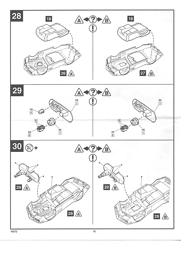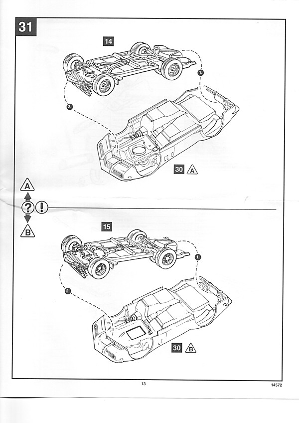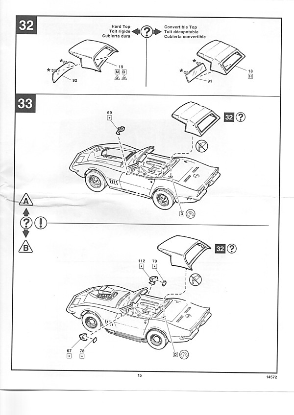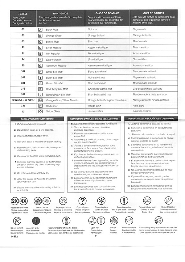 Die Bauanleitung ist Revell-USA typisch (noch) in Schwarz-Weiss. Zunächst gibt es eine ausführliche Stückliste, so dass auch jeder nachvollziehen kann, was er da gerade in der Hand hält. Die Baustufen für Stock- und Street-Version sind sauber voneinander getrennt, so kommt hier nix durcheinander. Revell schlägt als Außenfarbe anscheinend das Chevrolet Intern als Farbcode 980 laufende Riverside Gold Metallic vor (ein Orange-Metallic gab es für die Corvette nicht).