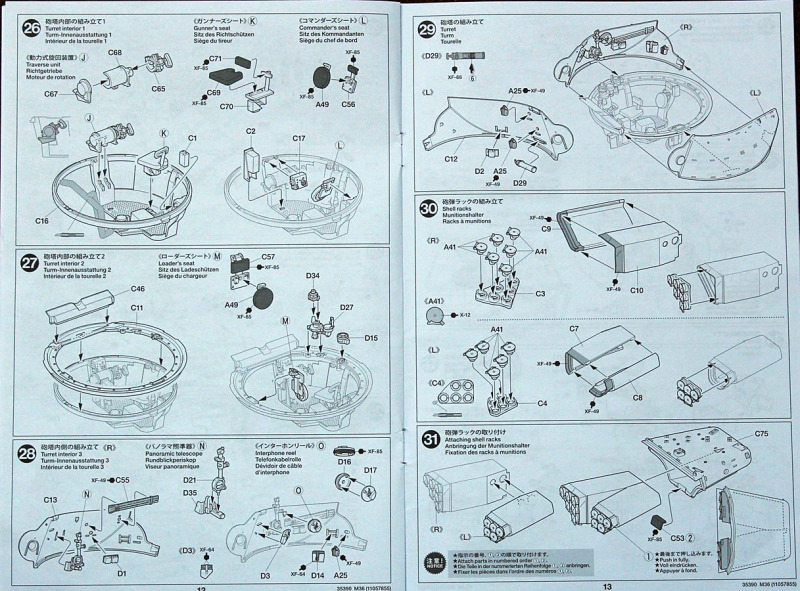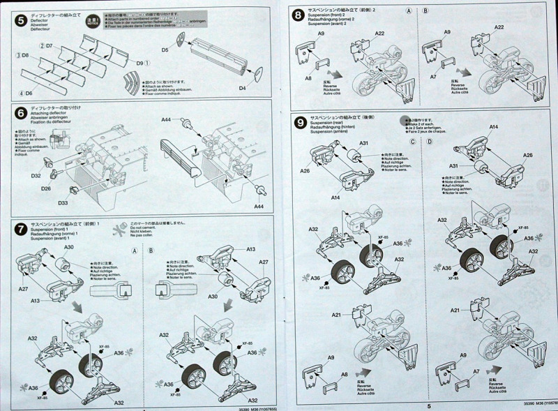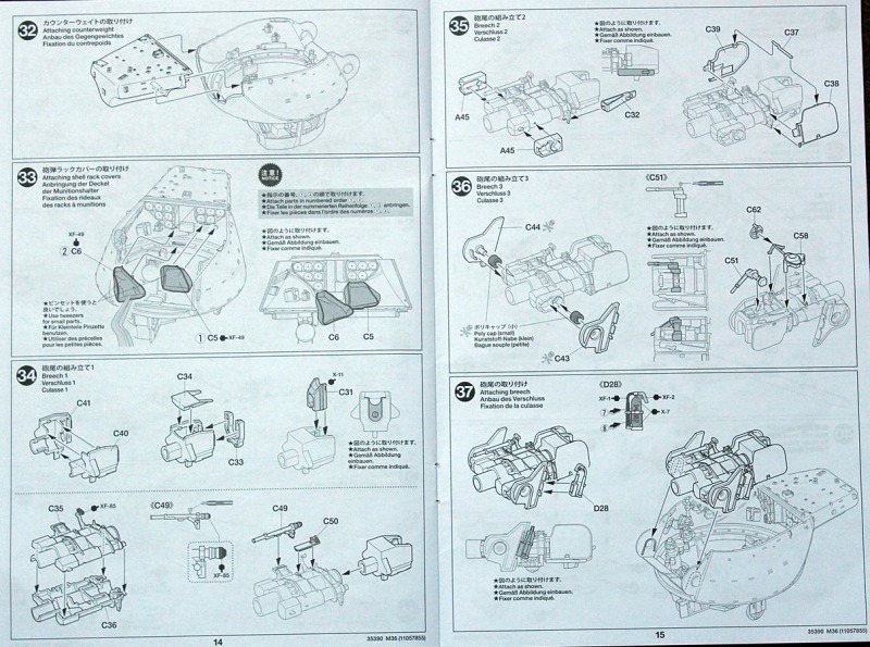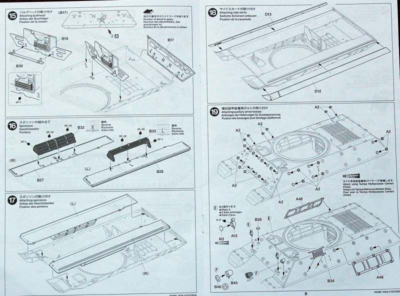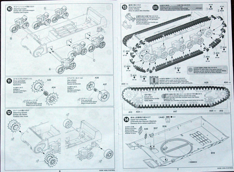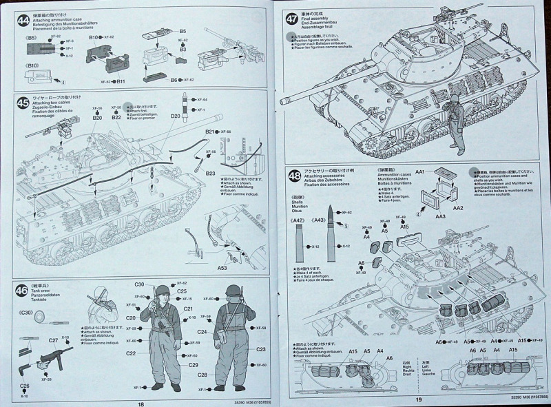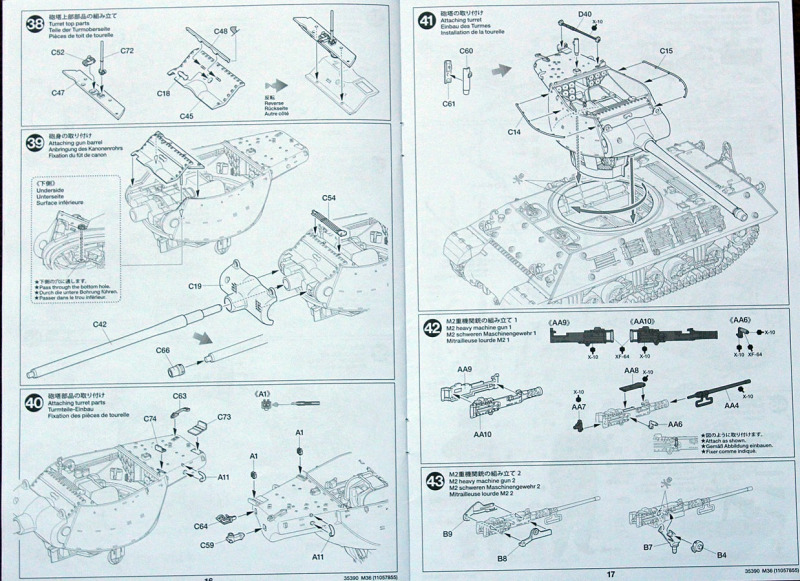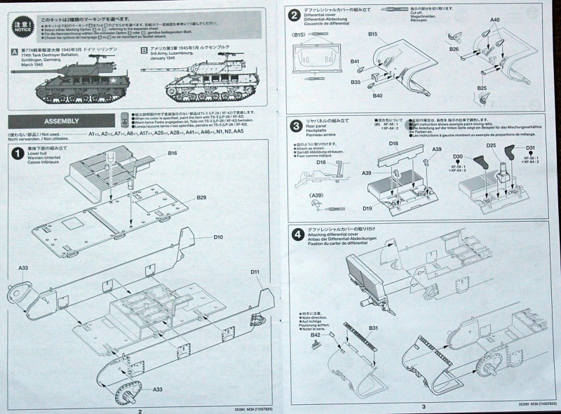 Besprechung:Zum VorbildZum historischen Vorbild kann man an dieser Stelle auf den Text anlässlich der Modellvorstellung des M36 von Academy (2017) verweisen. Über seine Einsätze im Zweiten Weltkrieg und in Korea hinaus fand der Panzerjäger M36 noch lange Jahre Verwendung, z.B. auf dem indischen Subkontinent und im früheren Jugoslawien. Aber auch das französische Indochina-Kontingent wurde mit dem Jagdpanzer in der späten Phase des Konfliktes (1951) ausgerüstet, wobei es sich um Fahrzeuge mit der 90 mm Kanone und Mündungsfeuerbremse handelte, über die die letzten 600 Exemplare der Produktion verfügten. Zwar hatte der von der Sowjetunion und der VR China unterstützte Viet-Minh (Vorläufer des Viet-Cong) keine eigenen Panzerfahrzeuge ins Feld geführt, jedoch befürchtete man in Frankreich, dass chinesische Panzer vom Typ IS 2 im Norden Vietnams eingesetzt werden könnten. Der zur Abschreckung eingesetzte Panzerjäger M36 steht für eine Phase des Krieges, in der nahezu ausschließlich amerikanisches Material auf französischer Seite eingesetzt wurde. Als Modell wurde der M36 erstmals 1975 von Tamiya aufgelegt, als M36B2 bereits sieben Jahre zuvor. In den folgenden Jahren und Jahrzehnten folgten immer wieder Modelle des M36 (z.B. Academy), wobei es sich aber auch teilweise um M36B1 (Italeri 1989, 2000, 2017) handelte, eigentlich um einen Sherman mit neuem Turm und 90 mm-Kanone. Modelle des M36 sind teilweise noch heute erhältlich (AFV-Club, Airfix). Die jüngste Umsetzung aus der M36-Familie stammt von Tamiya und ist gegenüber früheren Auflagen eine Neukonstruktion. Der BauplanAuf 20 Seiten im Hochformat (173 x 260 mm) wird der Bau des Modells in 48 Schritten anschaulich dargestellt, so dass beim Zusammenbau keine Probleme zu erwarten sind, da die Übersichtlichkeit durch eine durchdachte Zuordnung der Teile gewährleistet wird. Für den Zusammenbau der Segmentketten wird eine zusätzliche Seitenansicht abgedruckt. Außerdem müsste sprichwörtliche Tamiya-Qualität für ein gutes Gelingen garantieren – Näheres siehe Bauteile. Vermissen könnte man allerhöchstens eine Teileübersicht mit den jeweiligen Spritzlingsrahmen. Das ist inzwischen bei vielen Herstellern so etwas wie Standard; aber es geht auch ohne – alles ist eindeutig zuzuordnen. Dem Bauplan beigegeben ist noch ein Blatt mit allgemeinen Verarbeitungshinweisen und Tipps, das sich v.a. an Hobbyeinsteiger richtet. Daneben findet sich ein sechsseitiges Faltblatt mit Texten zur Geschichte des M36 (japanisch, englisch, deutsch, französisch) - vorbildlich. Nicht zuletzt finden wir auch dort zwei Farbseiten, welche die beiden im Bauplan vorgesehenen Varianten, jeweils in fünf(!) Ansichten zeigen. Optimum! Auch eine Schrägansicht des Fahrzeugs in einer Schwarz-Weiß-Grafik mit der Beschriftung wichtiger Fahrzeugteile finde ich sehr hilfreich. Nicht jeder weiß, wie das Dings vorne links heißt.