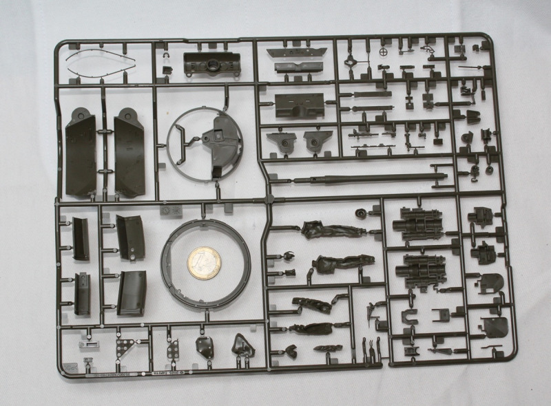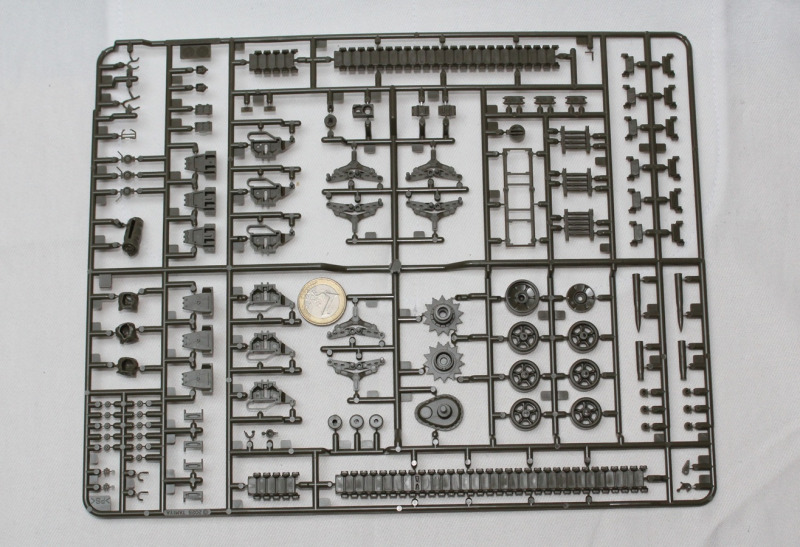 Die BauteileDie Einzelteile des Bausatzes machen einen sehr guten Eindruck: sauber gespritzt, teilweise sehr filigran. Höchstens die Flächen mögen etwas glatt erscheinen, aber auch das Original wies keine allzu raue Oberfläche auf. Das Deckelbild ist jedenfalls gut geeignet, um als Vorlage für eine farblich strukturierte Oberfläche zu dienen. Linienhaftes wie Schweißnähte sind dafür schön hervorgehoben. Insgesamt zeigt Tamiya mit dem Bausatz, was im aktuellen Herstellungsjahr mit dem klassischen Spritzgussverfahren möglich ist. Und das ist einiges... Das Thema: Panzerketten – persönliche Vorlieben und Aversionen bestimmen (allzu) oft die Diskussion. Bei Academy und Italeri setzte man früher auf die vinylartigen Gummibandagen, die vielen zu wenig Kettendurchhang ermöglichten. Auch Einzelgliederketten sind nicht nach jedermanns Geschmack. Tamiya löst das Problem mit Segmentketten, die aber auch nicht alle Modellbauer überzeugen, da im Bereich der Antriebsräder und Umlenkrollen Einzelglieder zusammengeklebt werden müssen und in Kombination mit den längeren Segmenten ordentlich Potenzial für Ungenauigkeiten bieten. Tamiya löst das Problem eigentlich sehr pfiffig: die längeren Kettensegmente haben auf der Innenseite jeweils eine Vertiefung, in die kleine Kunststoffnippel auf einer Stützrolle nach dem Prinzip Mönch und Nonne exakt hineinpassen. Entsprechende Laufrolle lässt sich durch eine Art Schlüsselloch eindeutig positionieren. Damit müsste sich die Kette problemlos zusammenbauen und „aufziehen“ lassen, wenn man die Reihenfolge beachtet, die durch Ziffern vorgegeben wird. Und es sei extra nochmal darauf hingewiesen: Nur das Abtrennen, was die Bauanleitung ausdrücklich frei gibt. Positiv vermerken darf man die wenigen Angusspunkte, was das Versäubern erheblich vereinfacht. Wer „out of the box“ bauen möchte, dem beschert Tamiya einen echten Convenience-Kit.