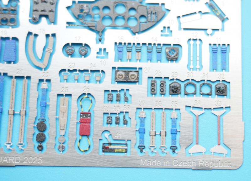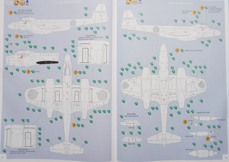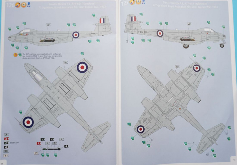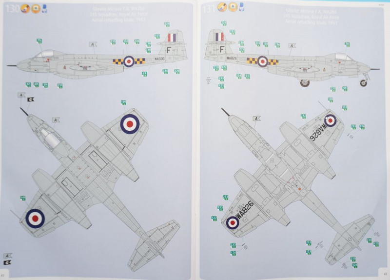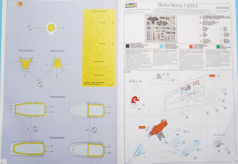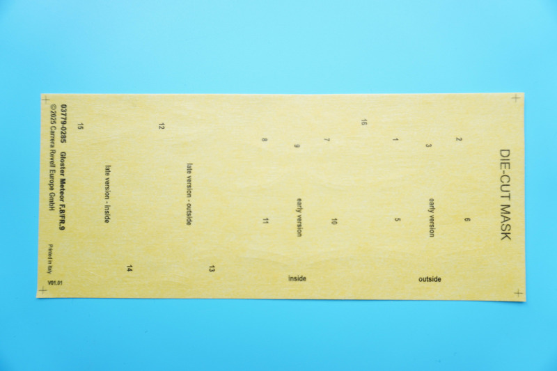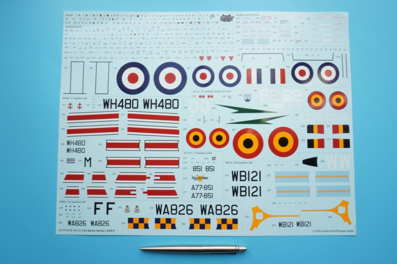 Lackierung, Versionen, Decals, MaskenBei der Auswahl einer der fünf Kit-Varianten hat der Bastler wirklich die Qual der Wahl. Nicht nur, dass es sich um teils recht farbenfrohe Vertreter dieses Jets in entweder Naturmetallausführung oder mit Sichtschutzanstrichen handelt. Es ist mit der FR.9-Variante auch die technisch interessante Aufklärervariante der Meteor dabei, die gar als "scharfe" Einsatzmaschine bei der Suez-Krise im Jahre 1956 geflogen ist. Und auch die RAAF-Maschine hat mit dem Einsatz über Korea eine kriegerische Vergangenheit vorzuweisen. Oder darf es vielleicht ein Zielschlepper der belgischen Luftwaffe sein, der in einem attraktiven Tarnschema mit orangen Signalfeldern daherkommt. Wie gesagt, die Qual der Wahl... Die Qualität der von Cartograf in Italien gedruckten Decals ist, wie nicht anders zu erwarten, von allererster Güte: kein Druckversatz, kräftige Farben, präzise Beschriftungen und dünne, glänzende Decaloberflächen, wie vom Hersteller gewohnt. Auch berichten erste Bastler online von einer hervorragenden Verarbeitung dieser Decals. Mit den enthaltenen Abklebemasken können die beiden Cockpitkanzeln jeweils von innen und außen maskiert und sprühlackiert werden.