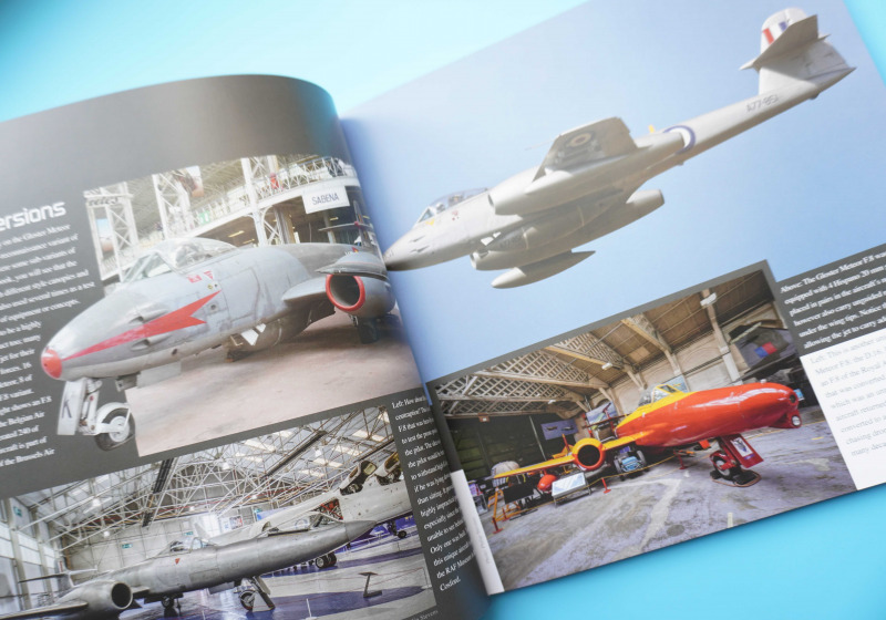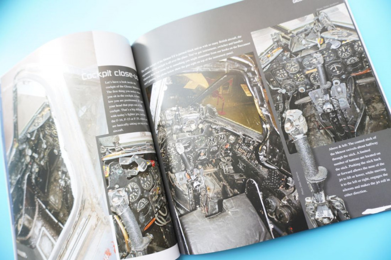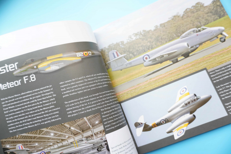 Gloster Meteor F.8 - Literatur von Duke HawkinsDie über dreißig Bücher von Duke Hawkins sind seit der Ausgabe der ersten Bände für Modellbauer in zweierlei Hinsicht sehr interessant. Zum einen werden meist originale, aktuelle Aufnahmen der Flugzeugvorbilder gezeigt, entweder live "on base" oder aus Museen oder Sammlungen, zum anderen sind die kurzen Begleittexte sehr informativ und beleuchten meist die technischen oder geschichtlichen Hintergründe des jeweiligen Flugzeugs, ohne zu zahlenlastig oder statistisch zu werden. Es sind kurzweilige, schön bebilderte und unterhaltsame Werke, die beim Lesen Freude machen. So ist es auch im vorliegenden Buch, was nach Angaben des Autors Hawkins extra aufgrund der von Revell angekündigten Herausgabe des vorliegenden Bausatzes erfolgt sei. So steuert das Buch interessante Information zu genau der von Revell dargestellten F.8 und FR.9 (und in Teilen auch anderen) -Varianten der Meteor bei. Auf der letzten Seite sieht man gar ein gebautes Modell des vorliegenden Bausatzes. Alles in allem eine wirklich sinnvolle, passgenaue Bausatzbeigabe. Aufgeschlagen - einige Buchseiten auszugsweise