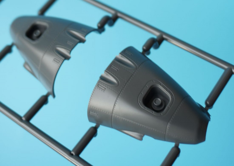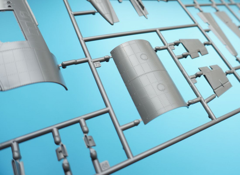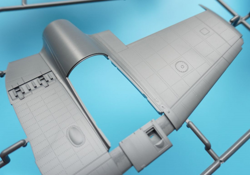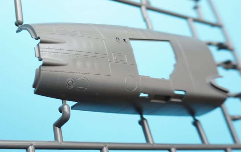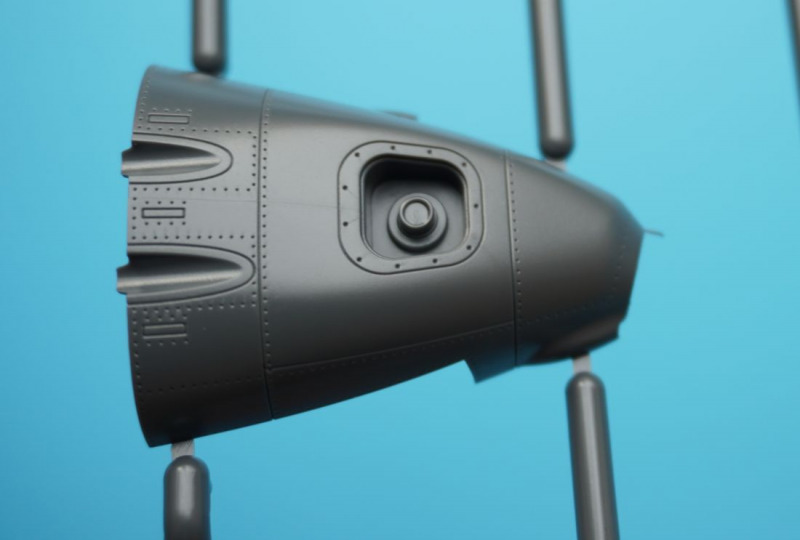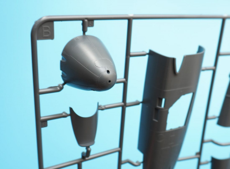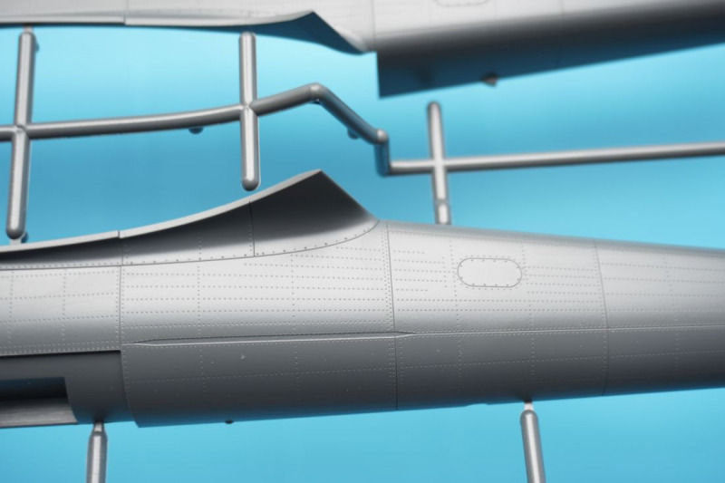 Und was ist das?Beim näheren Betrachten der Kunststoffteile fallen sofort zahlreiche knackige Panellines und messerscharfe Gravuren auf den Bausatzoberflächen ins Auge. Zudem ist das ganze Modell von unendlichen, realistisch wirkenden Nietreihen überzogen, bei denen sich Rundkopfniete und Senkniete je nach Modellbereich abwechseln. Da schlägt das Modellbauerherz höher! Es sind diese "scharfen" Gravuren bei Revells Flugzeugmodellen im Maßstab 1:32, die ich seit der Herausgabe der Hawker Hunter vor mehr als zwanzig (!) Jahren vermisst habe, und die leider auch bei Revells WW2-Repliken in 1:32 von Bf 109, Fw 190 und He 219 nicht vorhanden waren. Dort sind es eher verwaschen wirkende Modelloberflächen mit nur spärlicher Nietdarstellung. Und nun sind sie wieder da, diese klaren Gravuren, und daneben sogar noch einige weitere erfreuliche Features: auf den Panels der Kanonencowlings ist die manchmal beim Original verzogene/eingedellte Blechhaut sehr gut erkennbar. Diese als "strained surface" bezeichnete Verformung von Metalloberflächen ist hier erfreulich realistisch dargestellt. So eine Oberflächenbeschaffenheit war sonst nur bei den Großmodellen von Airfix (Typhoon, 1:24) oder Border Models (Lancaster, 1:32) zu finden und galt seinerzeit als "revolutionär" bei einem Mainstream-Polystyrolkit. Einige Details des Bausatzes