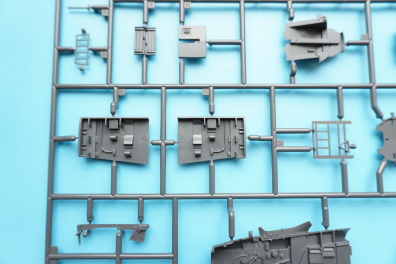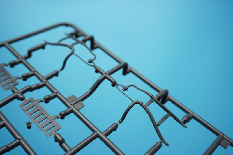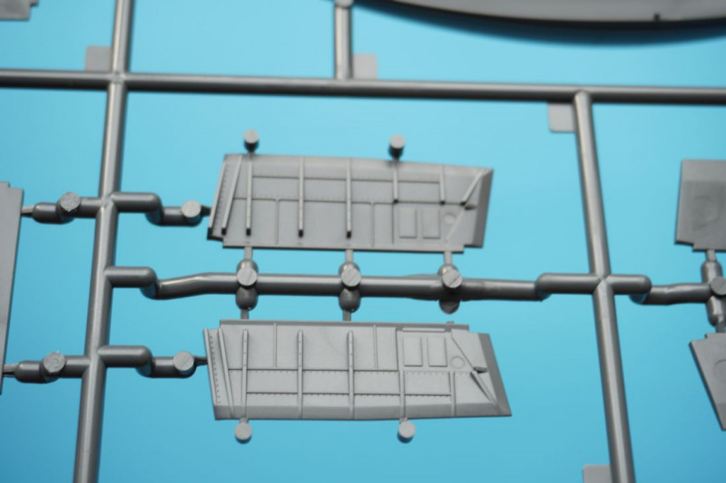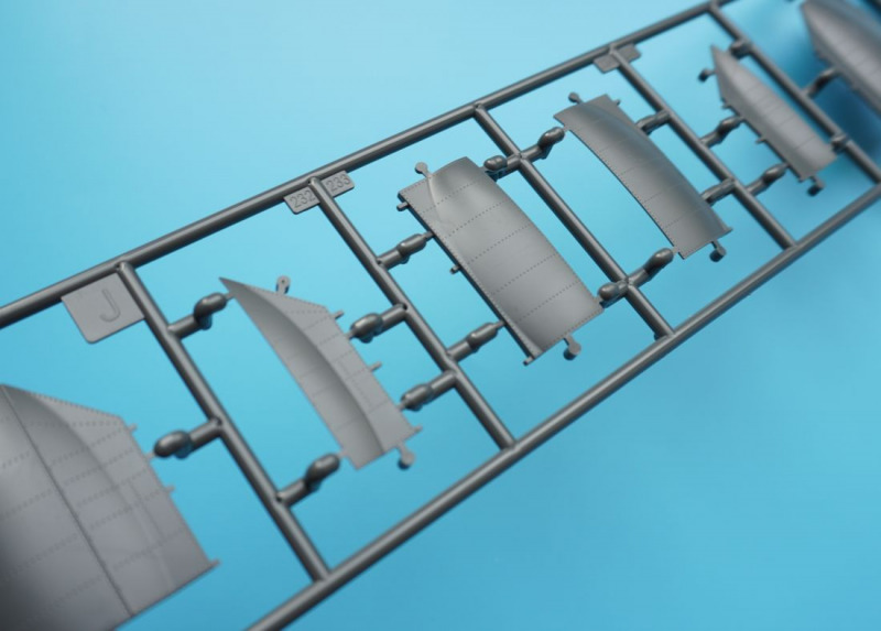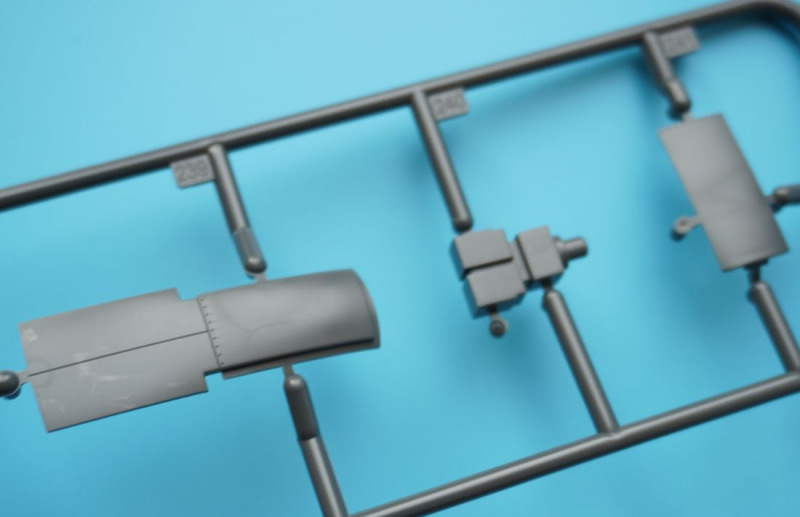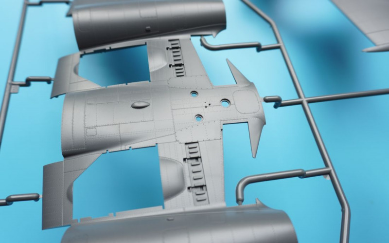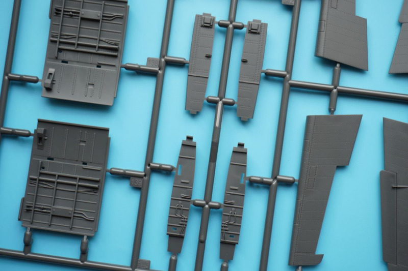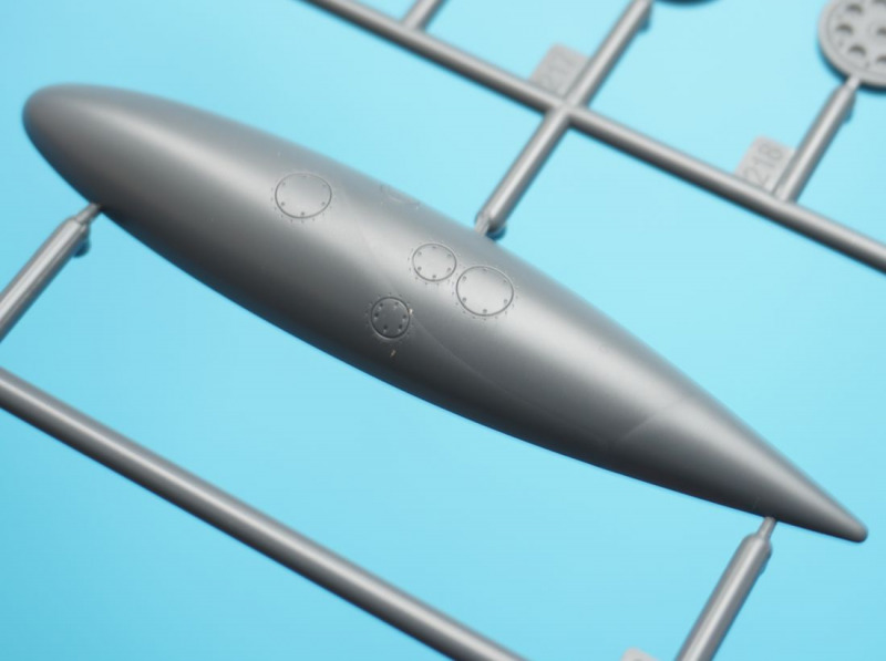 Und was ist das?Beim näheren Betrachten der Kunststoffteile fallen sofort zahlreiche knackige Panellines und messerscharfe Gravuren auf den Bausatzoberflächen ins Auge. Zudem ist das ganze Modell von unendlichen, realistisch wirkenden Nietreihen überzogen, bei denen sich Rundkopfniete und Senkniete je nach Modellbereich abwechseln. Da schlägt das Modellbauerherz höher! Es sind diese "scharfen" Gravuren bei Revells Flugzeugmodellen im Maßstab 1:32, die ich seit der Herausgabe der Hawker Hunter vor mehr als zwanzig (!) Jahren vermisst habe, und die leider auch bei Revells WW2-Repliken in 1:32 von Bf 109, Fw 190 und He 219 nicht vorhanden waren. Dort sind es eher verwaschen wirkende Modelloberflächen mit nur spärlicher Nietdarstellung. Und nun sind sie wieder da, diese klaren Gravuren, und daneben sogar noch einige weitere erfreuliche Features: auf den Panels der Kanonencowlings ist die manchmal beim Original verzogene/eingedellte Blechhaut sehr gut erkennbar. Diese als "strained surface" bezeichnete Verformung von Metalloberflächen ist hier erfreulich realistisch dargestellt. So eine Oberflächenbeschaffenheit war sonst nur bei den Großmodellen von Airfix (Typhoon, 1:24) oder Border Models (Lancaster, 1:32) zu finden und galt seinerzeit als "revolutionär" bei einem Mainstream-Polystyrolkit. Einige Details des Bausatzes
