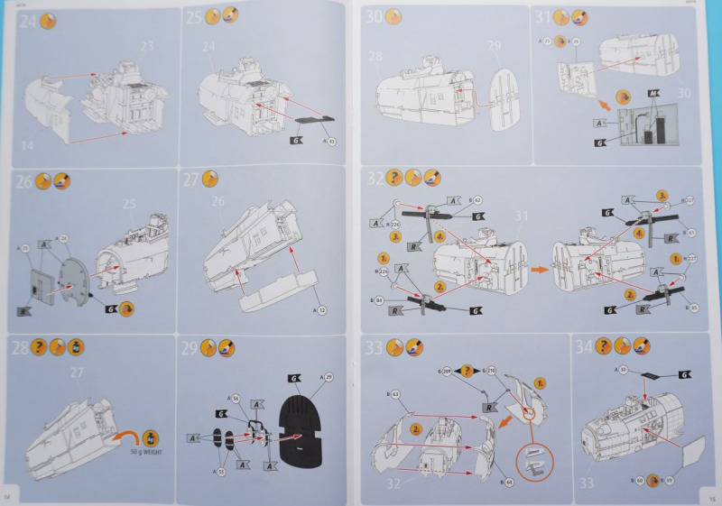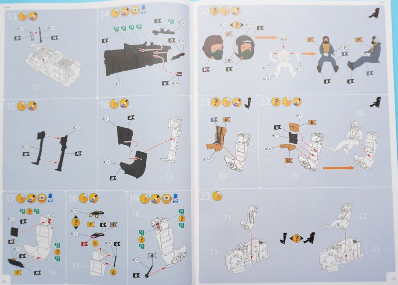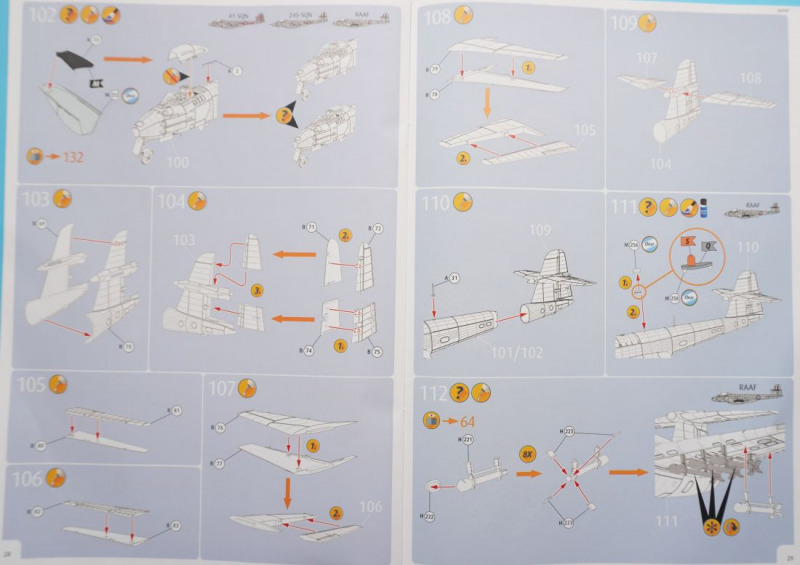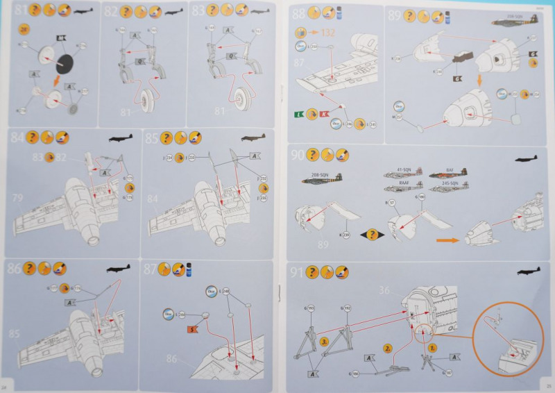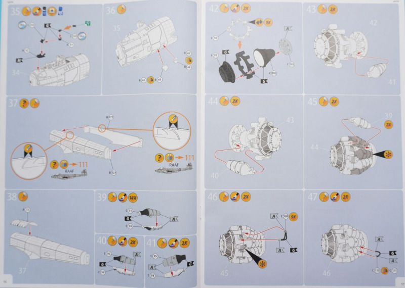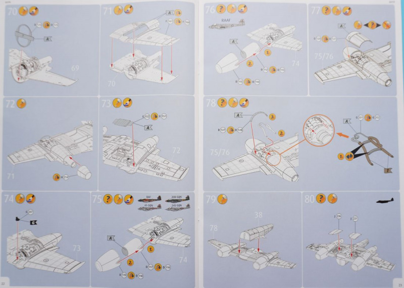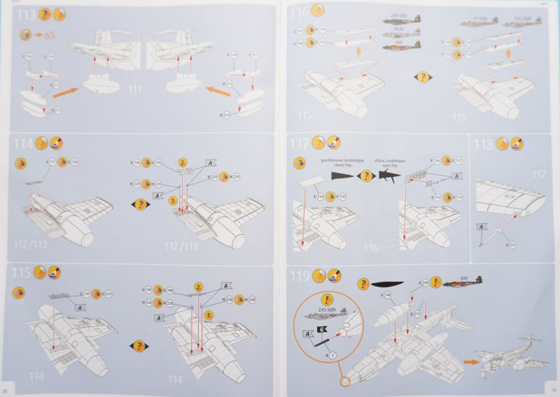 Hier die optionale Bugnase für die FR.9-Variante Besonderheiten beim BauIm Cockpit können die beiliegenden Fotoätzteile insbesondere am dortigen Schleudersitz für die Sitzgurte verwendet werden, oder man benutzt Bauteil A14, an dem die Sitzgurte angegossen sind, was meiner Meinung nach aber etwas statisch wirkt. Der beigefügte Pilot (Hurra, Revell, die Beigabe einer Pilotenfigur bei einem Flugzeugbausatz ist eine super Idee!) wird mit angegossenen Sitzgurten in das Cockpit hineingesetzt. Die Pilotenfigur selbst ist mit zwei Köpfen versehen, die wahlweise Kopfhaube oder Helm tragend dargestellt sind. Das Hauptinstrumentenbrett ist wahlweise mit Decals zu bekleben - hierfür sind ein flächiges Decal und einzeln gedruckte Rundinstrumente zu verwenden. Alternativ kommen wieder die Fotoätzteile zum Einsatz, die in vertrauter Weise nach dem Glätten des Instrumententrägers A44 in Schichtbauweise aufeinandergeklebt werden und dadurch eine gewisse plastische Tiefenwirkung erzeugen. Netterweise sind die Instrumentengläser bereits - Eduard sei dank - durch werkmäßig aufgebrachten Transparentlack dargestellt. Grundsätzlich sollte sich der Bastler vertraut machen mit den vorgesehenen einzelnen Bohrungen für Löcher im Rumpf und Flügeln zur Befestigung von Klein- und Anbauteilen wie Antennen, Raketen, Zusatztanks. So erwarten uns in Baustufe 64ff. einige versionsspezifische Bauschritte, bei denen man sich für die Vorbereitung der Montage der Raketenwerfer (für die australische Version) oder für die Anbringung der Außenlasttanks entscheiden muss. In Baustufe 33 besteht die Wahlmöglichkeit, die Einstiegshilfe unterhalb des Cockpits entweder ein- oder ausgeklappt zu montieren, wofür jeweils unterschiedliche Bauteile erforderlich sind. Die Kanonenabdeckungen, zwei Panels für jeweils die linke und rechte Seite, können ohne geklebt zu werden auf die beiden Rumpfhälften gesetzt werden (Baustufe 34). In Baustufe 90 kommt es zur Wahl der jeweils passenden Flugzeugnase: hier ist der Bau der Recce-Version für die FR.9-RAF-Variante möglich, und somit für eine technisch durchaus interessante Variante, oder man montiert die "Standardnase", die für die vier weiteren Versionen gebraucht wird. Tollerweise enthält der Kit zwei komplette Rolls-Royce Derwent 8 Jet-Triebwerke, die jeweils entweder im eingebauten Zustand bei geöffneter Abdeckung gezeigt oder auf dem jeweiligen Transportgestell angebracht und somit losgelöst vom Flugzeug präsentiert werden können. Eine klasse Sache! Außerdem ist beachtlich, dass man für die Variante der RAAF-Maschine andere vordere Triebwerkabdeckungen und Einlauftunnel verwenden soll, als bei den vier weiteren Varianten (Baustufen 75/76). Außerdem sind je nach Maschine zwei unterschiedliche Querruder an den Maschinen zu montieren, was in Baustufe 116 erläutert wird. Da scheint ordentlich recherchiert worden zu sein. Und Teile für die Grabbelkiste bleiben auch noch übrig. Erwähnenswert ist zudem die Montage des stabförmigen Luftbetankungsstutzens bei der F.8-Version der "WA-82" der 245 Squadron, während alle anderen Varianten mit "Standardnase" ohne diese markante Nasenspitze auskommen. Und endlich - die Fahrwerksreifen werden realistischer Weise im belasteten Zustand ("abgeplattet") dargestellt, so dass man sie ohne große Nacharbeit verbauen kann. Nach ersten vorliegenden Erfahrungsberichten im Internet sind die Passgenauigkeit und Montagelogik des Bausatzes sehr erfreulich. Hier wird auf die gut durchdachte Konstruktion, und insbesondere auf die an den Verbindungsstellen Rumpf-Flügel oder Vorder-Hinterrumpf deutlich werdende Stabilität der Verbindungselemente hingewiesen. Auch die Fahrwerkskonstruktion wird als sehr gut durchdacht und stabil beschrieben. Es wird auch vermerkt, dass der "Einbau" des Piloten im Cockpit das Weglassen der Ruderpedale erfordere und dass reichlich Ballast hinter dem Cockpit platziert werden solle, um keinen "Tailsitter" zu produzieren. Dies kann übrigens in den "leeren" Munitionsboxen erfolgen, die sich hinter dem Schleudersitz befinden und nach dem Befüllen mit Bleigewichten oder ähnlichen Beschwerungen einfach mit dem Munitionskistendeckel verschlossen werden. Insgesamt hören sich die bisherigen Bastel-Reviews des Kits allesamt sehr erfreulich an! Wenn das mal keine Vorhersehung für ein Modell des Jahres ist... Die Bauanleitung