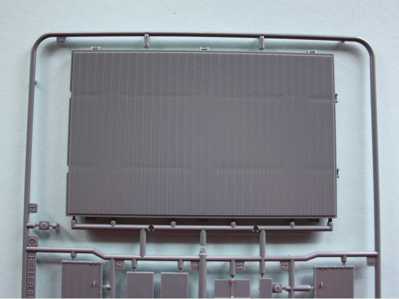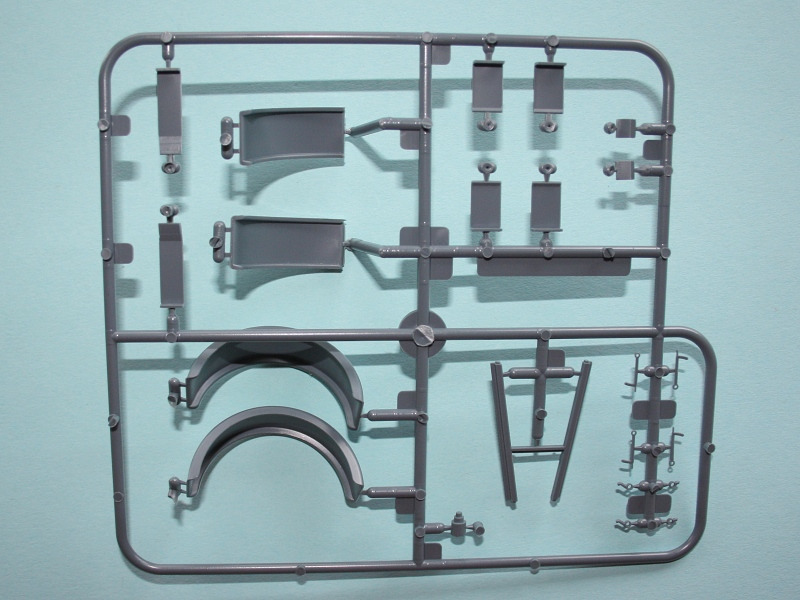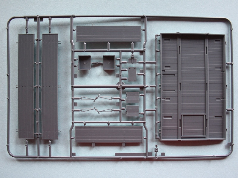 Die BauteileDer Bausatz ist sehr fein detailliert (89 Teile) und auch der Spritzguss ist auf der Höhe der Zeit. Fischhaut und Auswerfermarken sind nicht vorhanden. An einigen Teilen sind leichte Sinkstellen vorhanden, stark betroffen davon ist die Oberseite der Ladefläche. Doch wer Nutzfahrzeuge baut, wird dieses Problem von anderen Kits kennen, sie sind oft an Stellen zu finden, wo an der Unterseite Rahmenteile anmodelliert sind. Dieses Problem bekommt kaum ein Hersteller in den Griff!