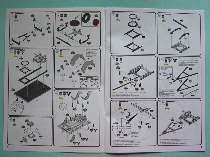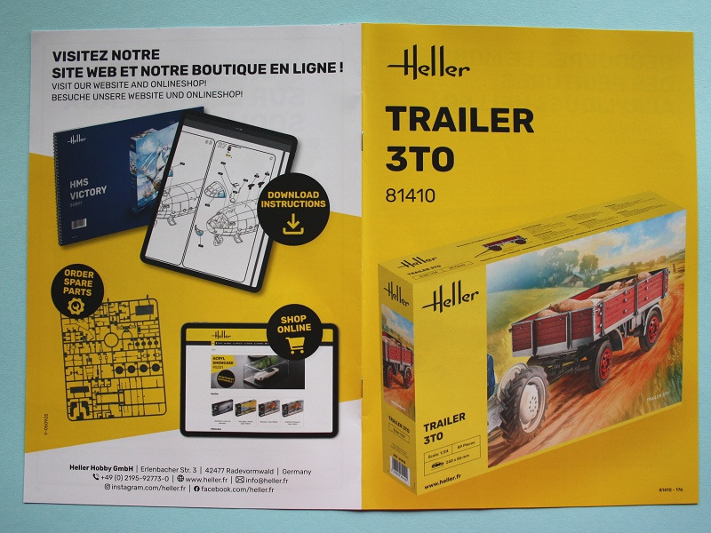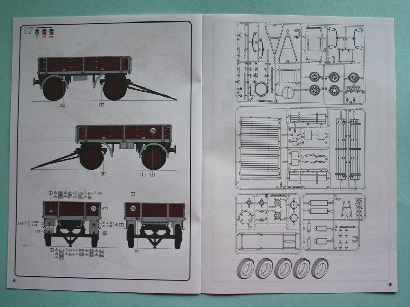 Die Reifen aus Vinyl-Vollmaterial weisen ein zeitgemäßes Profil auf, eine Beschriftung ist nicht vorhanden. Die Decals sind sauber und versatzfrei gedruckt, sie bieten eine große Auswahl an verschiedenen Kennzeichen. Auch an ein Typenschild, Tonnagebeschriftung und das obligatorische 25 km-Schild ist in dreifacher Ausführung wurde gedacht. Die Bauanleitung führt in 17 Schritten zum fertigen Modell, in den jeweiligen Schritten sind die zu verbauenden Teile farbig dargestellt. Es gibt Farbangaben, die sich auf das Sortiment von Humbrol-Heller beziehen. Für die Baustufe 14 ist ein Korrekturblatt beigelegt, hier sind in der Bauanleitung die Teilenummern für die Radnaben falsch angegeben.