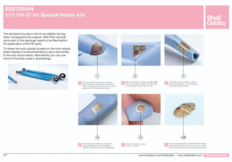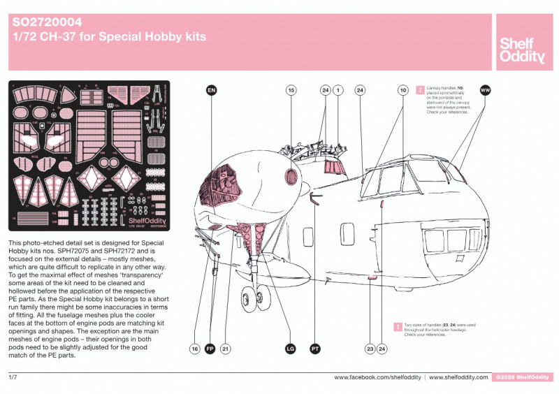 Besprechung:Fast zwei Jahrzehnte sollte es dauern, bis der geneigte Modellbauer endlich einen Detailsatz für den Großraumtransporthubschrauber CH-37 bekommen hat. Meiner Meinung nach ist dieser für den erfolgreichen Bau zwar nicht notwendig, erleichtert die realistische Darstellung des Hubschraubers jedoch ungemein. Zum Umfang des Sets gehören vor allem die vielen Gitter, welche am Hubschrauber verbaut werden, aber auch weitere Griffe, Details für das Fahrwerk, Scheibenwischer sowie diverse weitere Details am Rumpf. Die Teile sind sehr dünn und lassen sich leicht verbiegen, was zugleich Fluch und Segen sein kann. Für die meisten Gitter muss man mit dem Dremel an den Rumpf heran und entsprechende Bereiche entfernen. Dabei sollte man insbesondere im Bereich des Rotorkopfs darauf achten, dass später kein Licht, das durch die Fenster in den Rumpf fällt, sichtbar bleibt. In einigen Fällen kann es jedoch ausreichen, die darunterliegenden Flächen schwarz zu lackieren und das Ätzteil darüberzukleben. Am Heckausleger sollte man den Dremel allerdings unbedingt einsetzen, da beim Vorbild hier ebenfalls Licht einfällt. An den Motorgondeln werden die Kunststoffteile hingegen einfach durch die deutlich feineren PE-Teile ersetzt. Empfohlen wird, kleine Plastikstreifen als Klebefläche zu verwenden; zudem sollen sich die Bausatzteile gut als Biegehilfe eignen. Trotz dieser Hilfen ist das Anbringen der Teile recht aufwändig und erfordert einiges an Geduld, nicht zuletzt wegen der nur durchschnittlichen Passgenauigkeit. Das Ergebnis kann sich jedoch sehen lassen. Zu bedenken ist außerdem, dass der Einsatz der PE-Gitter an den Motorgondeln den Blick ins Innere freigibt, weshalb gegebenenfalls einfache Attrappen ergänzt werden sollten, um einen Blick ins Leere zu vermeiden.