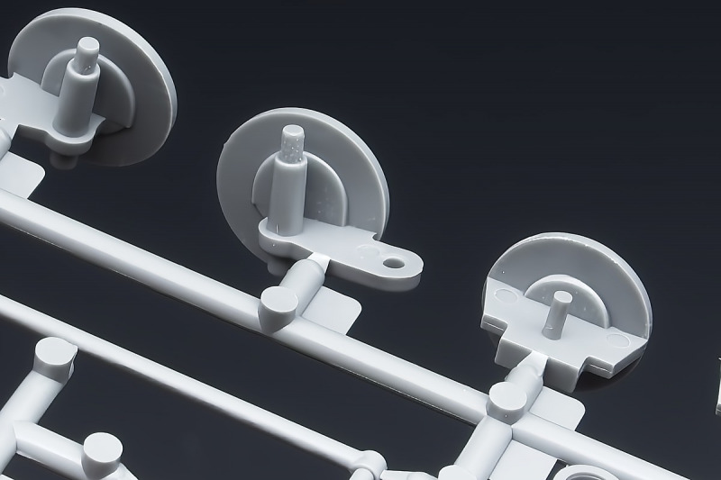 Dieses Bauteil wird fast komplett mit Carbon-Decals belegt Der Bausatz ist eine komplette Neuentwicklung von Revell. Die knapp über 100 Bauteile, überwiegend in diesem sehr angenehmen grauen Kunststoff, sind von sehr guter Qualität und Detaillierung. Die Karosserie besteht aufgrund der komplizierten Formen aus mehreren Teilen. Die Trennstellen wurden geschickterweise so gewählt, dass man die einzelnen Segmente vor dem Zusammenbau lackieren kann. Die Auswerfer liegen im nicht sichtbaren Bereich, Grat ist kaum vorhanden und es gibt lediglich zwei kleine Sinkstellen, die man bearbeiten muss (eine am Außenspiegel, eine an der Karosserie). Beim Motor hat man sich auf das Wesentliche beschränkt. Das Meiste davon verschwindet in den Tiefen der Karosserie und ist am fertigen Modell kaum zu sehen. Die Bemalung des sichtbaren Teils ist eine kleine Herausforderung, da es sich im Wesentlichen um ein, zwei Bauteile handelt. Achsen und Unterboden sind ebenfalls sehr einfach aufgebaut, deswegen aber nicht weniger gut detailliert. Die Vorderräder können lenkbar angebaut werden und mit etwas sauberem Arbeiten bleiben die Räder am fertigen Modell drehbar. Aber Vorsicht! Die Passung der Radbolzen ist sehr eng, man bekommt sie kaum noch einmal auseinander wenn sie mal "sitzen". Die vier Bridgestone Sport ZRF-Reifen hat Revell sehr gut wiedergegeben. Das gummiartige Material wirkt sehr überzeugend, die Profilierung entspricht dem Original. Die Größenunterschiede zwischen vorne (265/30 ZRF 21) und hinten (345/25 ZRF 22) wurden natürlich berücksichtigt. Da man die Bremsanlage durch die recht offenen Felgen sehr gut sieht, hat Revell diesen Bereich sehr gut gestaltet. Die Bremsscheiben haben ein Lochmuster und die angegossenen Sättel sind mit einigen schönen Details versehen. Passende Schriftzüge sind mit auf dem Decalbogen. Der Innenraum ist für mich das Highlight des Bausatzes. Zwar kann man die Türen nicht geöffnet anbauen, jedoch dürfte man durch die großzügige Verglasung am fertigen Modell noch einiges davon sehen. Man kann den Wagen als Rechts- oder als Linkslenker bauen. Revell hat sich hier sehr viel Mühe gegeben, das Ganze so nah wie möglich an das Original zu bringen. Für die Bemalung sollte man sich ein paar Fotos vom Original anschauen, je nach Ausstattungspaket variieren die Farben ein wenig. Es gibt wieder reichlich Decals für die vielen Bedienteile und Anzeigen im Cockpit. Die Karosserie wird noch mit einigen Anbauteilen versehen. Selbstverständlich sind Spiegel, Scheinwerfergläser oder der Scheibenwischer separate Bauteile. Ich habe schon mal einige Passproben vorgenommen und keinerlei Probleme festgestellt. Die Klarsichtteile sind leider wieder einmal von gemischter Qualität. Während die große Frontscheibe noch ganz ok aussieht, sind die seitlichen Fenster ein wenig schlierig. Eigentlich unverständlich, da die Teile nur leicht gebogen sind. Eine der beiden hat eine kleine Macke, trotz separatem Beutel.