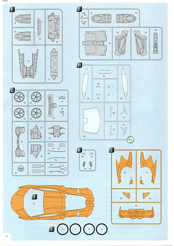 Der sehr sauber in Italien gedruckte Decalbogen ist für ein Zivilfahrzeug recht üppig ausgefallen. Das liegt zum Einen an den zahlreichen Carbon Look-Decals, zum Anderen an den (leider oftmals fehlerhaften) Kennzeichen. So ist das GB-Kennzeichen noch aus der EU-Zeit, besser wäre hier UK mit einem kleinen Union Jack gewesen, zumal die "25" auf das Zulassungsjahr 2025 hindeutet. Der Bogen enthält auch alle benötigten Schriftzüge und Logos. Außerdem erleichtert Revell uns die Bemalung des Innenraums, da auch die farblich auf die Außenfarbe abgestimmten Elemente für die Türverkleidungen enthalten sind. Diese setzt natürlich voraus, dass man sich für das Orange entscheidet. Die Carbondeclas sind ein bisschen tricky, hier muss man stellenweise aufpassen, dass man die richtigen Decals verwendet. Zum Beispiel an den Innenteilen der seitlichen Lufteinläufe, hier muss man pro Seite nicht weniger als acht Decals aufbringen, alle mit unterschiedlichen Formen. Die 20-seitige Bauanleitung ist wegen der vielen Hinweise ein wenig unübersichtlich. Zwar werden immer nur wenige Bauteile verwendet, man muss aber trotzdem sehr genau hinschauen, dass alle Farben und Decals an den richtigen Platz kommen. Vor allem die vielen Grau- und Schwarztöne sind etwas verwirrend. nebenbei bemerkt sollte man bei Revell mal über eine Erweiterung der Farbpalette nachdenken. Dieses Schwarz-Dunkelgrau-Gemisch z.B. ist mittlerweile fast bei jedem Bausatz erforderlich. Auf der letzten Seite wird auch die Funktion des Plastikwinkels ersichtlich, er ist für ein kleines Namensschild. Scheint auch neuerdings immer mit dabei zu sein, sehr nützlich - Danke, Revell. Darstellbare Fahrzeuge: