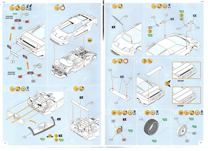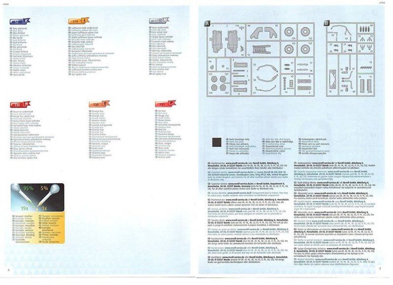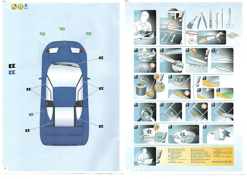 Dem Brett ist nichts mehr hinzuzufügen! Der 12 x 12 cm messende Decalbogen ist von der gewohnt guten Qualität printed by Cartograf. Er enthält eine ganze Reihe sehr nützlicher Decals, die das Modell weiter aufwerten. Besonders hervorzuheben sind die diversen Typenschilder und Plaketten sowie die Wurzelholz-Decals für das Armaturenbrett. Letzere sind super gelungen. Beim Angebot an Nummernschildern dürfte jeder was passendes für sich finden. Aber Obacht! Revell nimmt es mit der Authentizität von Nummernschildern nicht immer hundertprozentig genau. Die Bauanleitung ist mit 30 Seiten und 80 Baustufen mehr als umfangreich ausgefallen. Die einzelnen Baustufen sind daher seeehr übersichtlich, selten werden mehr als drei Bauteile gleichzeitig verbaut. Drei Seiten Bemalungsanleitung für einen Pkw findet man bei Revell auch eher selten (der zeitgleich erschienene Lambo-Bausatz muss sich mit einer Seite begnügen). Bis auf eine Farbe muss bei diesem Modell nichts zusammengemischt werden.