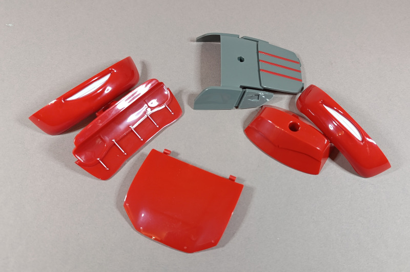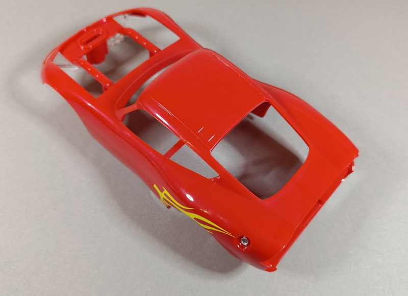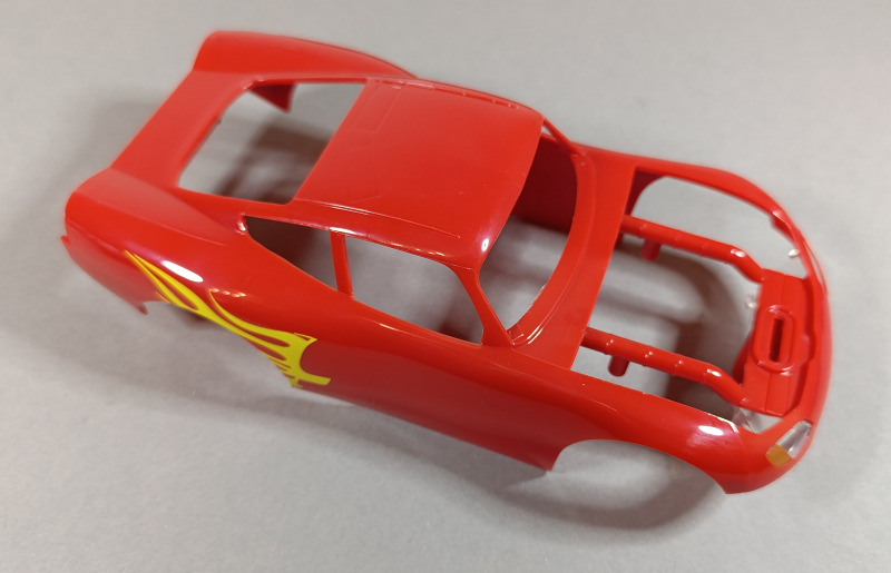 Die Karosserie ist teilweise bereits bedruckt, und auch die Scheinwerfer sind schon angebracht. Der eingefleischte Fan des ersten Films dürfte allerdings wissen, dass Lightning McQueen eigentlich keine echten Scheinwerfer besitzt, sondern lediglich aufgeklebte Sticker trägt, aber hier wollen wir einmal nicht zu pingelig sein. Der Großteil der Verzierung muss dennoch per Aufkleber angebracht werden. Dabei kann die Hilfe der feinfühligen Finger eines erfahrenen Modellbauers durchaus von Vorteil sein.