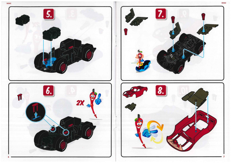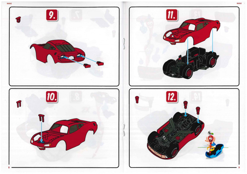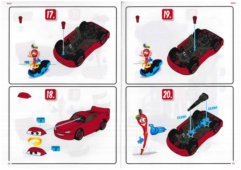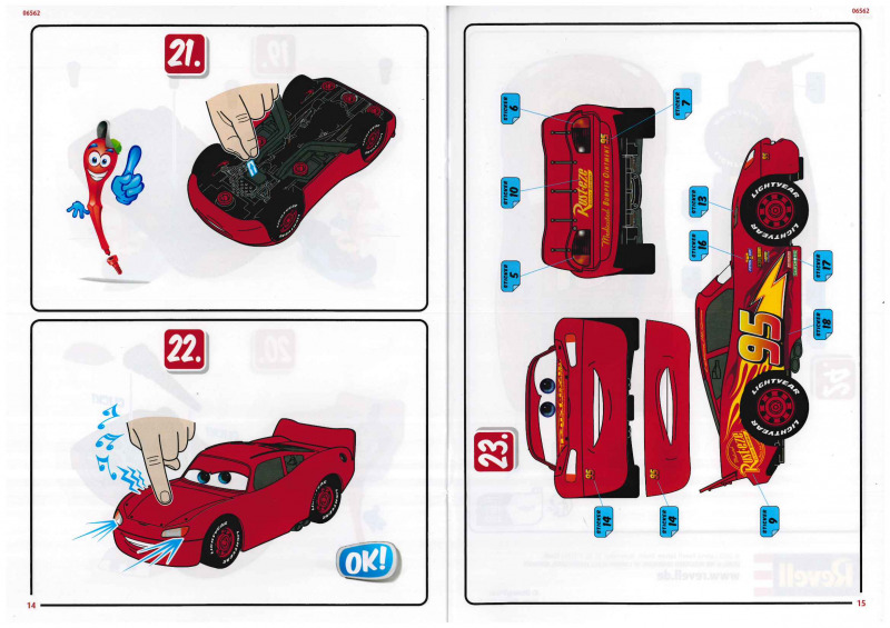 Der Karton ist ein deutlich stabilerer Stülpkarton, als man es sonst von Revell gewohnt ist. Er ist gut gefüllt, und die insgesamt 41 stabilen Bauteile sind in mehreren Tüten verpackt. Hinzu kommen die Anleitung sowie ein Bogen mit Stickern. Die Montage gestaltet sich denkbar einfach. Die meisten Teile werden zusammengesteckt oder mit großen Kunststoffschrauben verbunden. Als kindgerechter Schraubenzieher dient dabei die Kardanwelle, was ich für eine sehr gelungene Lösung halte, viele Designelemente erfüllen hier einen tieferen Zweck. Besonders gut gefällt mir die Darstellung des Motors; hier hat der Entwickler viel Liebe zum Detail bewiesen. Der Clou dabei: Der Motor ist zugleich das Herzstück der Elektronik, aus dem später die Sound- und Lichteffekte gespeist werden und in dem auch die Batterien untergebracht sind. Für den Batteriewechsel ist dann allerdings ein normaler Schraubendreher erforderlich. Mithilfe der drehbaren Frontscheibe, die bei Cars die Augen der Charaktere darstellt, sowie zweier unterschiedlicher Stoßstangen (in denen sich der Mund befindet), lassen sich zwei verschiedene Gesichtsausdrücke darstellen. Insgesamt machen alle Teile einen guten Eindruck und ermöglichen eine gelungene Darstellung von Lightning McQueen. Einige Bauteile lassen sich jedoch etwas schwer einklicken, etwa die Haltespangen oder die Felgen der Reifen, was für Kinderhände mitunter etwas fummelig sein kann.