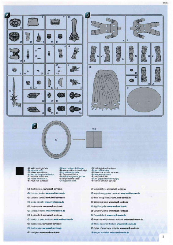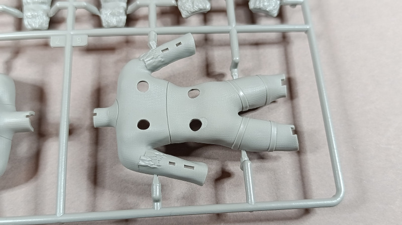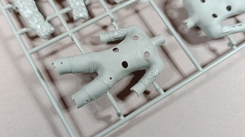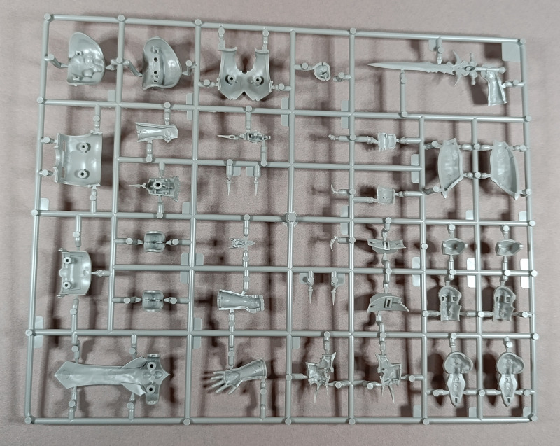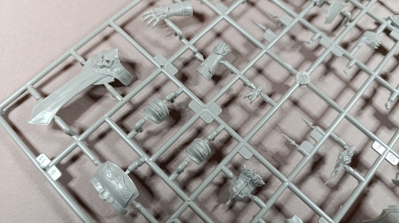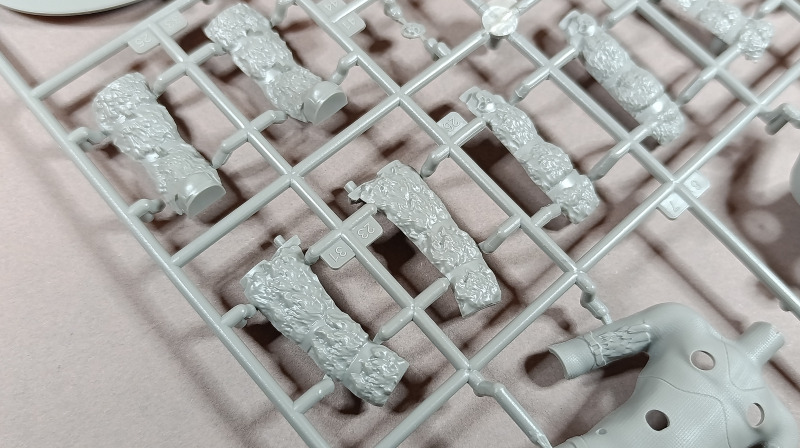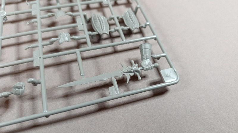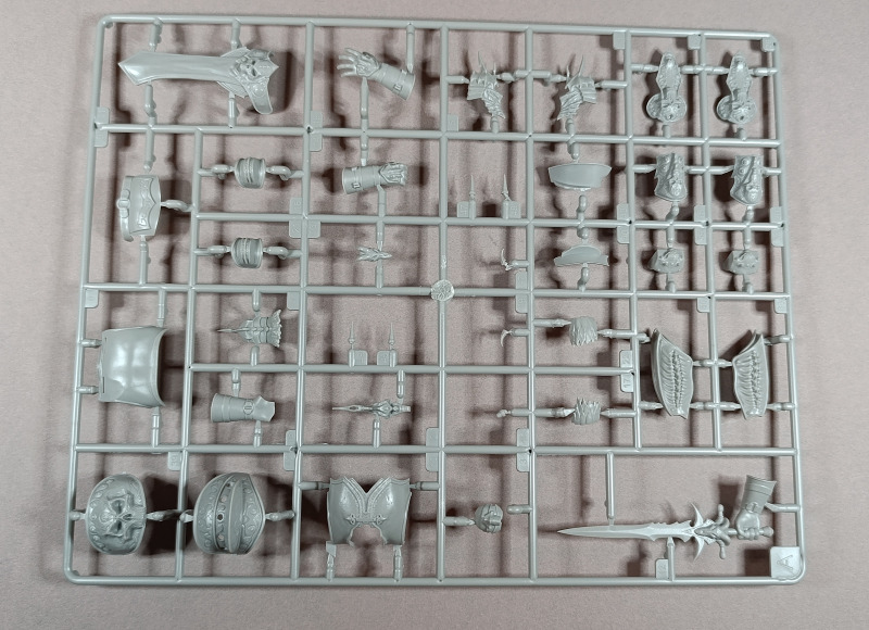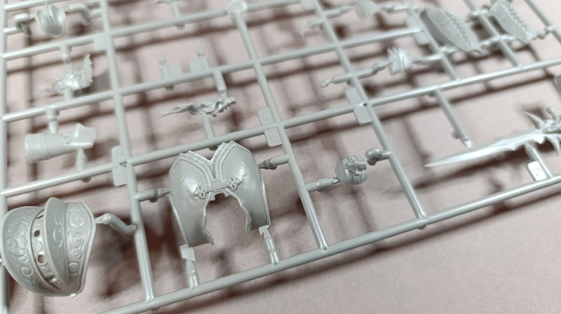 Kommen wir zum Plastik: Dem Bausatz liegen zwei Gussrahmen mit insgesamt 52 sauber gespritzten Teilen bei, dazu kommen der Sockel sowie ein separates Namensschild. Letzteres empfinde ich persönlich als eher unglückliche Lösung. Zum einen findet sich in der Mitte eine Art Sinkstelle, zum anderen bleibt in der Präsentation nur die Möglichkeit, es – ähnlich einem Namensschild auf dem Schreibtisch – separat daneben zu platzieren. Eine Kombination aus Namensschild und Sockel wäre hier vermutlich die elegantere Lösung gewesen. Der Sockel selbst, beziehungsweise der Sockelrahmen, liegt ebenfalls separat bei und macht qualitativ einen deutlich besseren Eindruck. Allerdings kippelt er leicht und sollte daher plan geschliffen werden, um einen sicheren Stand zu gewährleisten. Die Teile der Figur selbst verteilen sich auf zwei Gussrahmen. Wie nicht anders von einem New Tool zu erwarten, sind die Teile von hervorragender Qualität. Auf dem ersten Gussrahmen finden sich vor allem die hochdetaillierten Teile der Rüstung. Die Ornamente an den Schultern sind makellos ausgeführt, am Brustpanzer sind sogar leichte Dellen dargestellt, und auch die Stoffstruktur am Gurt weiß zu überzeugen. Der Helm ist mehrteilig aufgebaut und verdeckt den Großteil des Gesichts. Man muss schon etwas suchen, um dieses zu entdecken; es ist nur teilweise dargestellt, aber dennoch ausreichend wiedergegeben. Was mir ebenfalls aufgefallen ist, betrifft das Schwert: Dieses ist zwar sehr gut getroffen, allerdings fehlen die Runen, wie sie auf der Verpackung zu sehen sind. Hier wären zumindest ein paar Decals eine sinnvolle Lösung gewesen. Rahmen B beherbergt die grundlegenden Bauteile für den Körper. Dieser ist mit einer Riffelstruktur überzogen, die vermutlich die Ringrüstung darstellen soll. Die Idee ist grundsätzlich sehr gelungen, erschwert jedoch das Versäubern der Klebenaht erheblich – vor allem dann, wenn man die Struktur nicht zerstören möchte. Ein vollständiges Nachgravieren wäre jedenfalls eine Herkulesaufgabe; möglicherweise fällt am Ende aber auch kaum noch etwas davon auf. Die Fellrüstung ist strukturell angedeutet, wirkt jedoch etwas zu glatt, wodurch der Plastiklook leider durchscheint. Hier könnte es helfen, die Oberfläche leicht aufzurauen oder – sofern vorhanden – echtes Fell im passenden Maßstab zu verwenden, was durchaus gut umsetzbar wäre. Der Umhang zeigt wiederum eine überzeugende Stoffstruktur, allerdings verraten die Löcher recht deutlich seine Materialstärke. Zudem wirken diese etwas zu akkurat; mit etwas ausgefransteren Kanten käme der Effekt vermutlich noch besser zur Geltung.