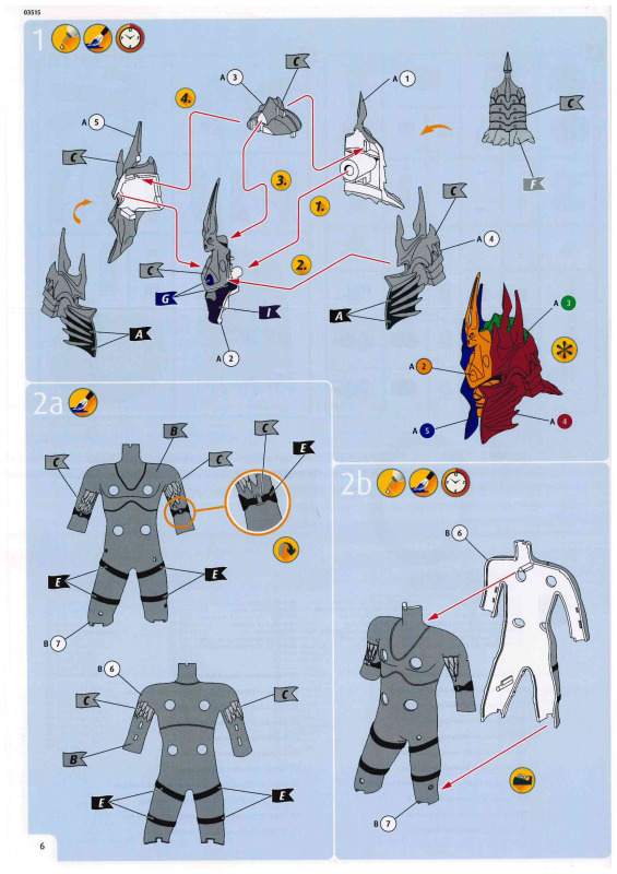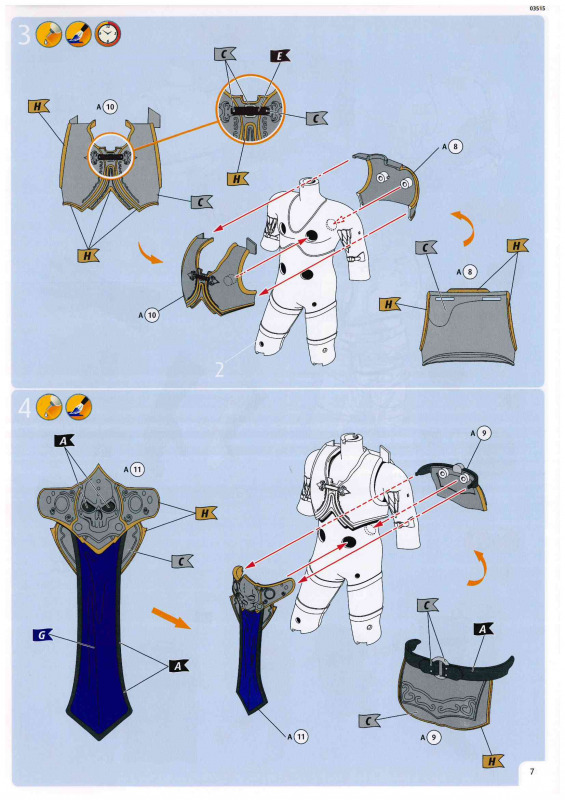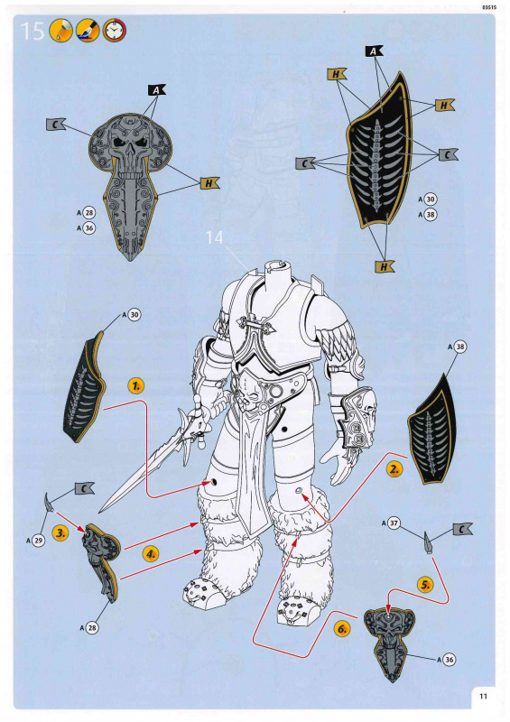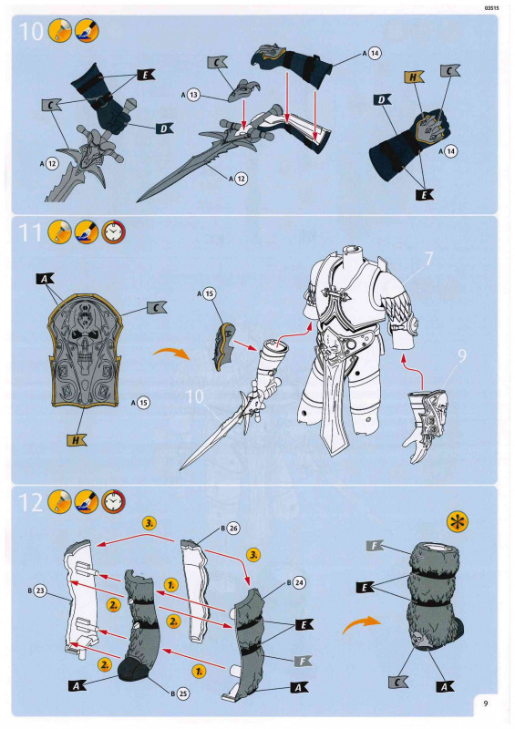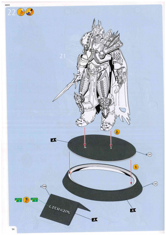 Bemalung und AbziehbilderDie Abziehbilder geben den Schriftzug „Lich King“ lediglich in zwei verschiedenen Ausführungen wieder. Wie bereits erwähnt, wären zusätzliche Runen für das Schwert wünschenswert gewesen. Bei der Bemalung empfiehlt sich eine genaue Recherche. Mir scheint, dass man hier in Bünde nicht allzu sorgfältig gearbeitet hat und die Vorbildrecherche etwas oberflächlich ausgefallen ist. So soll der Umhang laut Anleitung blau bemalt werden, obwohl es sich beim Vorbild eher um einen sehr dunklen, nahezu schwarzen Farbton handelt. Auch die Handschuhe sind mit Staubgrau angegeben, während meine Recherchen eher auf einen dunklen Lederton hindeuten. Gleiches gilt für die Gesichtsfarbe, die ebenfalls nicht ganz stimmig wirkt. Wer also Wert auf eine möglichst korrekte Darstellung legt, dem ist dringend zu empfehlen, die Farbgebung anhand eigener Recherchen zu überprüfen und gegebenenfalls anzupassen.