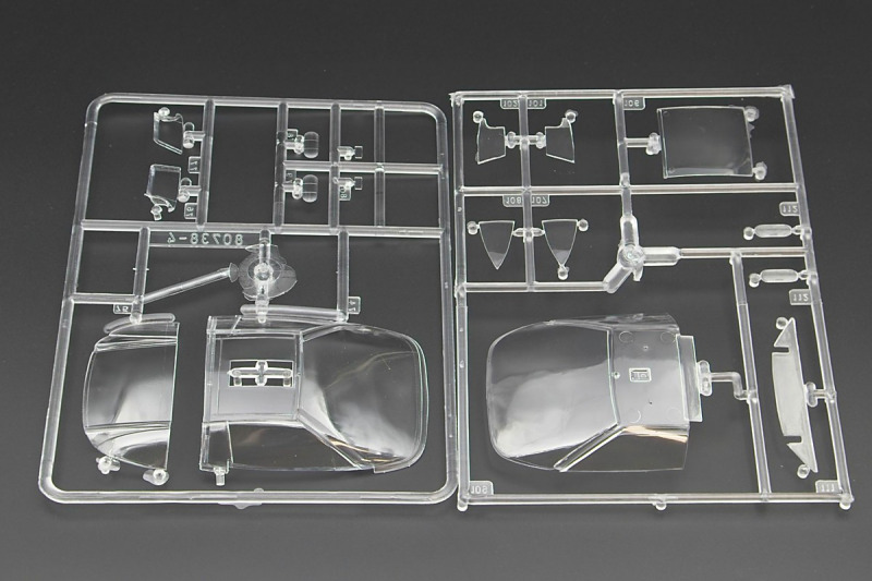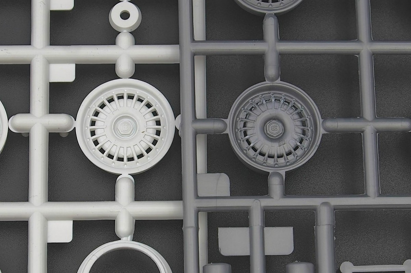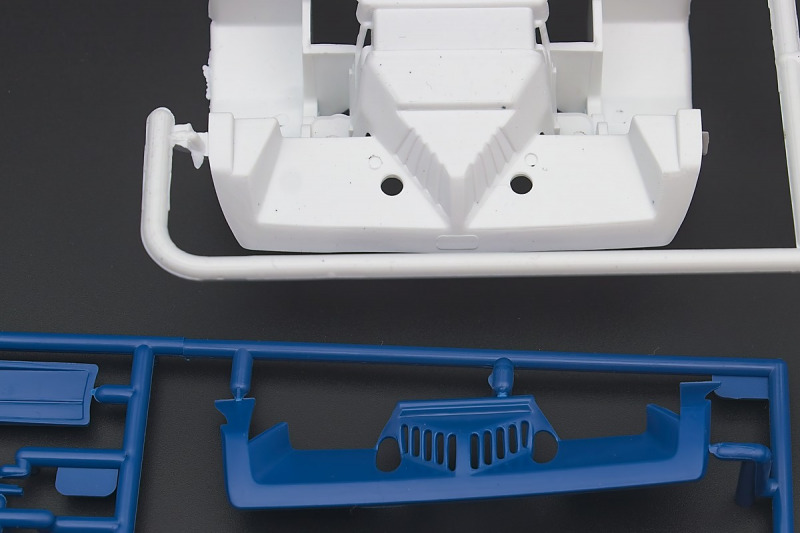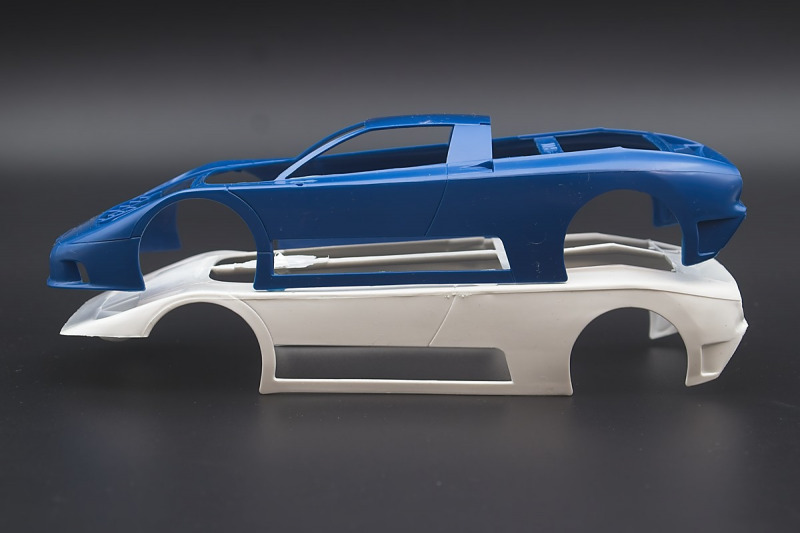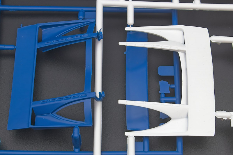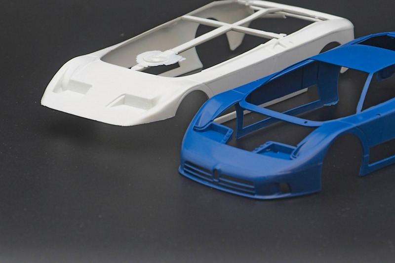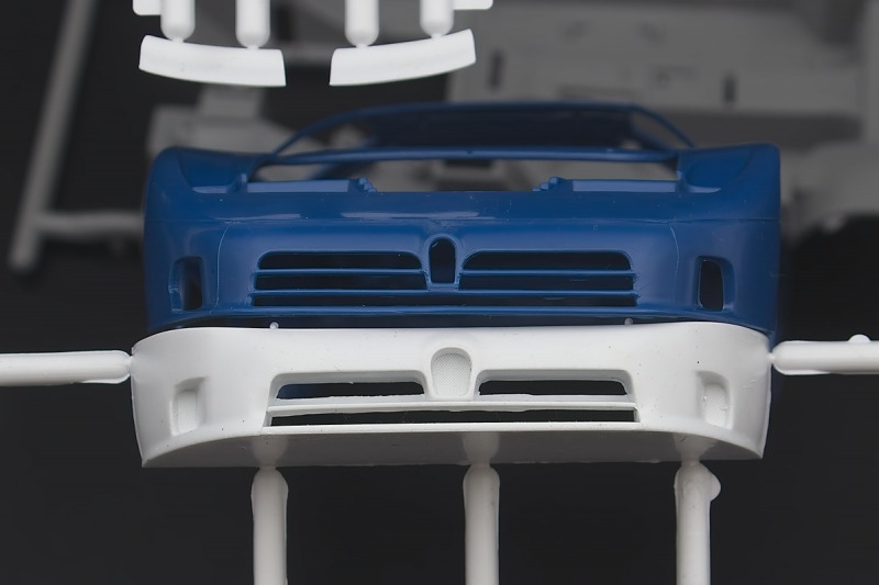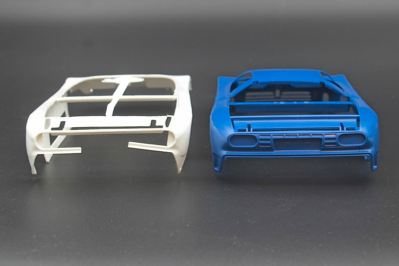 Während bei Revell die Front- und Heckschürze bereits am Karosserieteil vorhanden sind, muss man diese bei Heller separat anbauen. Dadurch ist das Rohteil sehr filigran, was sich durch einen leichten Verzug bemerkbar macht. Unterschiede im Detail gibt es sowohl vorne als auch hinten. Bei Heller gibt es vorne nur zwei anstelle von drei Schlitzen, außerdem ist das Bugatti-Emblem deutlich breiter. Revell hat das wesentlich besser getroffen. Am Heck liegt der Unterschied in den Rücklichtern, bei Heller sind sie höher als bei Revell. Da geht der Punkt für mich an Heller. Bei beiden Modellen kann die Heckklappe beweglich angebaut werden, um den darunter liegenden Motor zu betrachten. Revell bietet zusätzlich eine zu öffnende Fronthaube, wo man z.B Batterie und Bremsanlage bestaunen kann - Punkt für Revell. Die Türen bleiben bei beiden Modellen leider zu. Revell bietet im Gegensatz zu Heller noch einen ausgefahrenen Heckspoiler an.