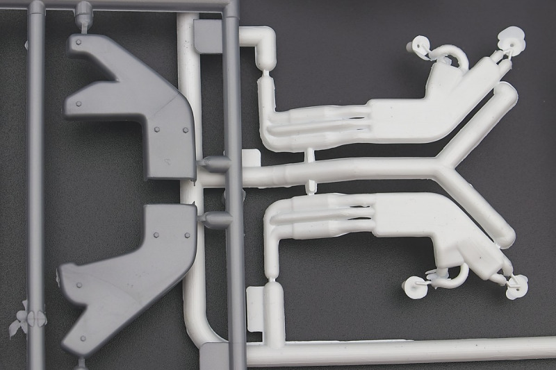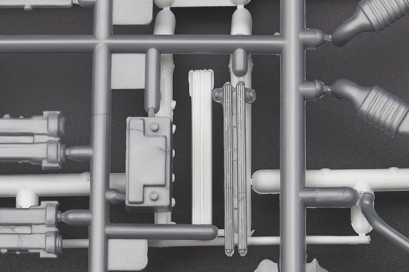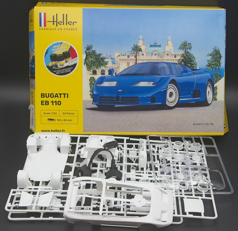 BesprechungAllgemeinesDer Bugatti EB110 wurde bisher zweimal als Modell im Maßstab 1:24 umgesetzt. Einmal von Heller, einmal von Revell (die Auflage von Airfix stammt aus den Formen von Heller). Beide Bausätze sind kurz nach Erscheinen des Originals entstanden, nämlich 1992. Da Revell Ende 2025 sein Modell endlich mal wieder neu aufgelegt hat, bietet sich ein Vergleich der beiden Bausätze an. Wir schauen uns im Folgenden die wesentlichen Bereiche Karosserie, Motor, Innenraum und Fahrwerk an. Zunächst aber ein paar allgemeine Daten, da geben sich die beiden Modelle nicht viel. Eine ansprechende, nützliche Verpackung, Kunststoffteile, Klarsichtteile, Gummireifen, Decals und eine farbige Bauanleitung findet man bei beiden Bausätzen. Man bekommt bzw. bekam sie mit und ohne "Starterset". Bei Revell werden 148 Bauteile (in drei Fraben gespritzt) benötigt, bei Heller sind es nur 84 (ausschließlich weiße Bauteile). Chromteile gibt es bei beiden nicht (Ausnahme: Erstauflage Revell). Beim ersten Betrachten der Spritzlinge fällt sofort die unterschiedliche Philosophie auf, mit der beide Hersteller seinerzeit ans Werk gegangen sind. Bei Heller findet man große Baugruppen, bei Revell ist alles eher klein-klein. Auf den folgenden Bildern liegen die Heller-Teile links, die von Revell rechts, sofern nicht anders vermerkt (oder: Heller weiße Bauteile, Revell nicht weiße Bauteile).