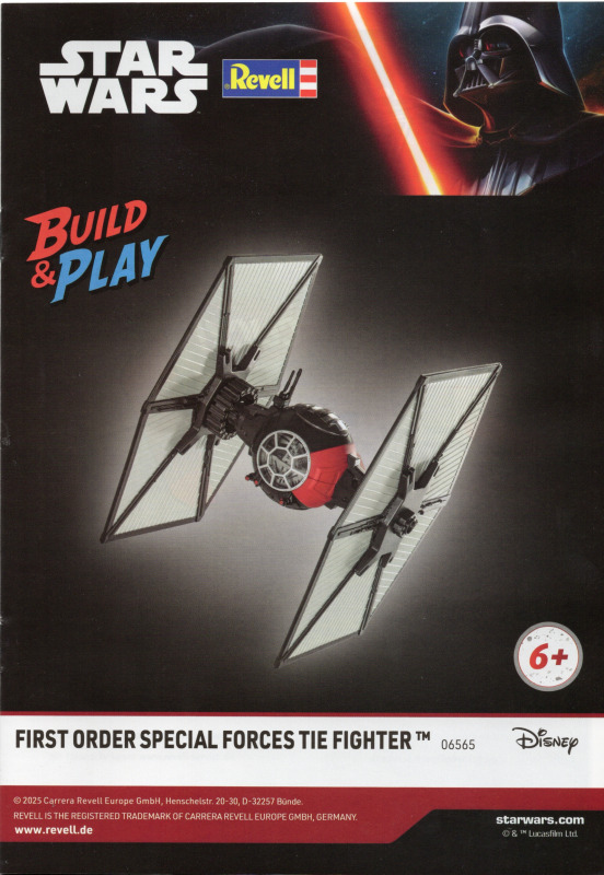 Anwendung: Build & Play / Level 1 Charakter - Sehr einsteigerfreundlich - Altersempfehlung laut Revell: 6+ Zusatz-Zitat laut Revell-Webseite: ACHTUNG. Nicht geeignet für Kinder unter 36 Monaten. Erstickungsgefahr durch verschluckbare Kleinteile. Dieses Produkt erzeugt Lichtblitze, die bei empfindlichen Personen epileptische Anfälle auslösen können. Die Verpackung bitte aufbewahren, da sie wichtige Informationen enthält. Farb- und technische Änderungen vorbehalten. FazitDer First Order Special Forces TIE Fighter ist für mich kein Bausatz für Perfektionisten oder Detailfanatiker - und das will er auch gar nicht sein. Stattdessen liefert Revell hier ein unkompliziertes Build-&-Play-Modell, das schnell aufgebaut ist und sofort etwas hermacht. Dank Licht- und Toneffekten sowie dem Displayständer eignet sich das Set sowohl zum Spielen als auch als dekorativer Blickfang im Regal. Für erfahrene Modellbauer ist es eher eine nette Ergänzung. Für Kinder, Einsteiger und Fans ist er jedoch aus meiner Sicht eine sehr stimmige Wahl. Weitere InfosReferenzen Eine mögliche Bezugsquelle direkt auf der Revell-Webseite ist hier zu finden. Diese Besprechung stammt von Marco Jakobs - 02. März 2026 © 2001-2026 Modellversium Modellbau Magazin | Impressum | Links |
