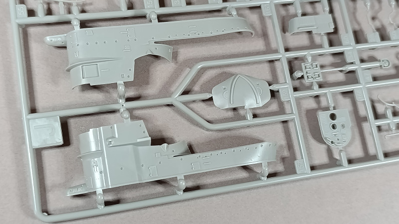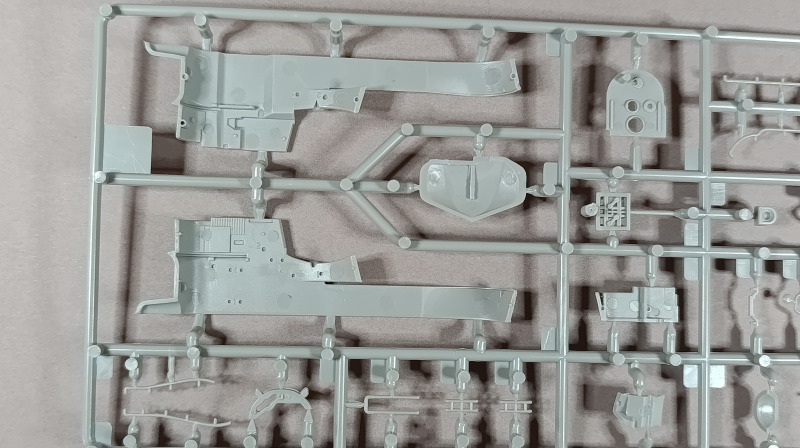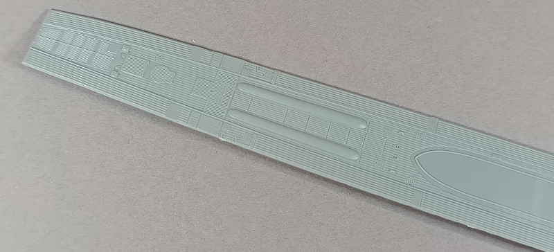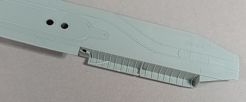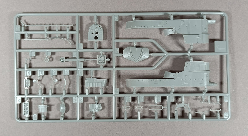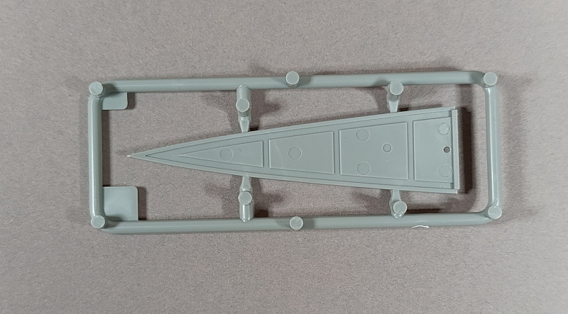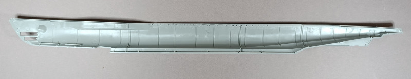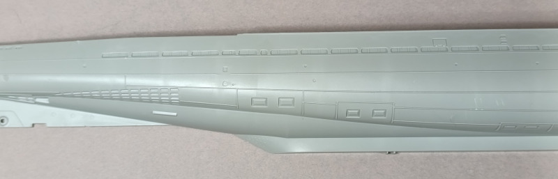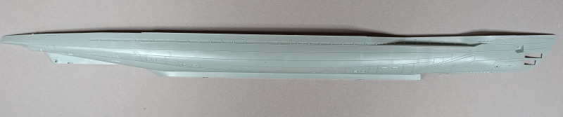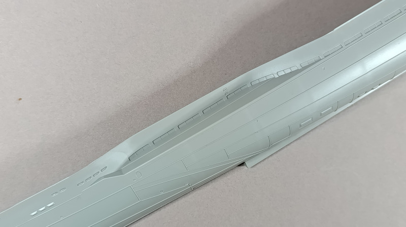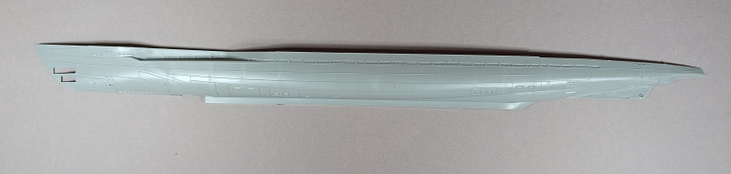 Der Bau beginnt mit den Torpedoklappen, die allerdings nur rudimentär dargestellt sind. Anschließend werden drei Querspanten zur Stabilisierung eingesetzt, bevor die beiden Rumpfhälften miteinander verbunden werden. Mit einer Länge von 53,1 cm entspricht das Modell dem Original maßstäblich sehr genau, was in Zeiten von CAD allerdings keine große Herausforderung mehr darstellt. Im Vergleich zum 1:72-Bausatz wirkt es zudem so, als sei das Modell im Wesentlichen herunterskaliert worden. Die Schweißnähte am Rumpf sind erhaben, jedoch etwas zu prominent ausgeführt. Wer möchte, kann sie leicht herunterschleifen, ansonsten muss man damit leben. Die Flutschlitze sind versenkt und ausreichend tief dargestellt, lediglich die oberhalb des Hecktorpedos wirken etwas schwach und könnten nachgraviert werden. Die Torpedoausstoßöffnung kann offen oder geschlossen gebaut werden. Auch der Schacht für den Schnorchel wird in diesem Bauabschnitt eingesetzt. Die Passung des Rumpfes ist sehr gut und mit ein paar Klemmen problemlos zu bewältigen. Das Deck ist dreiteilig ausgeführt, zwei Teile liegen separat bei, eines befindet sich am Gussrahmen. Vereinzelt scheint der Mittelteil verzogen zu sein, bei meinem Exemplar war jedoch alles in Ordnung. Die Deckstrukturen, insbesondere am Bug, sind hervorragend getroffen und dürften selbst mit PE-Teilen kaum besser darstellbar sein. Auch hier überzeugt die Passung. Vor dem Einsetzen des Mittelteils muss der Schnorchel montiert werden; laut Anleitung soll er ohne Klebstoff eingesetzt werden und bleibt dadurch beweglich.