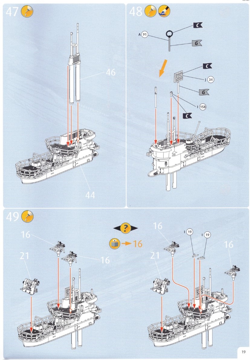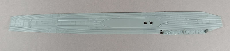 Nach dem Zusammenfügen des Rumpfes werden noch kleinere Bauteile ergänzt. Am Bug sind dies der Anker, zwei seitliche Leitflossen sowie eine weitere Flutschlitzöffnung. Am Heck folgen Schrauben, Ruder und ebenfalls Leitflächen. Die Teile sind sauber ausgeführt und ausreichend detailliert. Die vorderen Torpedoklappen können wahlweise geöffnet oder geschlossen dargestellt werden. Auf dem Oberdeck kommen weitere Kleinteile wie Poller und Gestänge für die Takelage hinzu. Der beiliegende Ständer ist schlicht gehalten. Andere Hersteller sind hier zwar kreativer, doch die einfache Konstruktion aus vier Teilen mit separatem Namensschild ist zweckmäßig und lässt sich mit einer passenden Bemalung durchaus ansprechend gestalten.