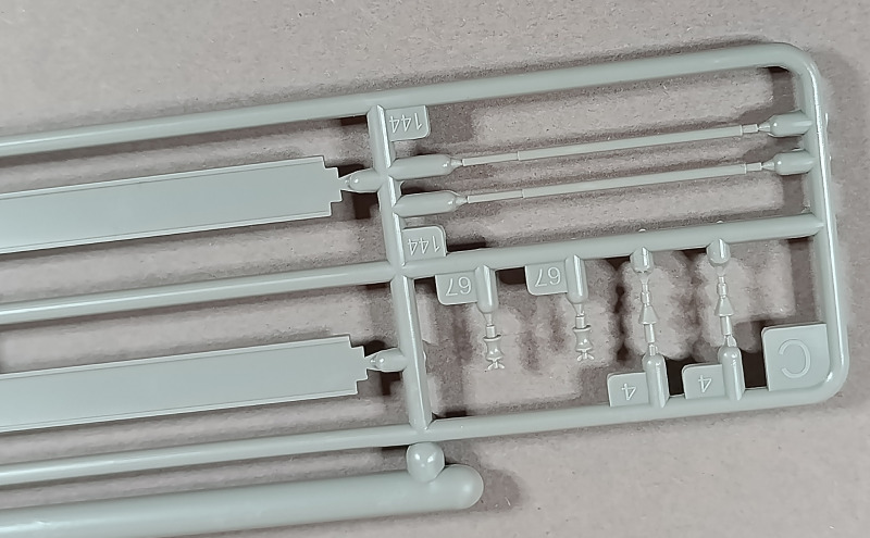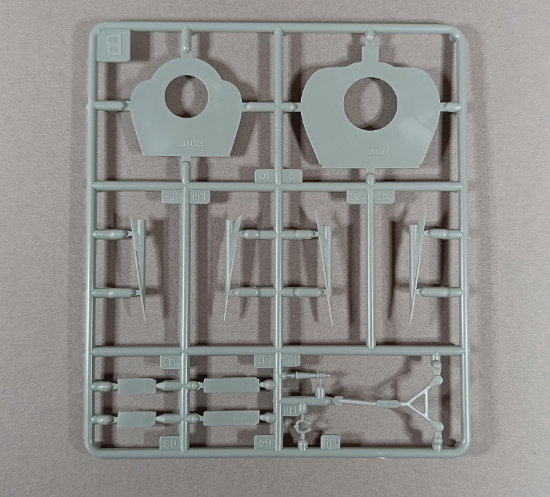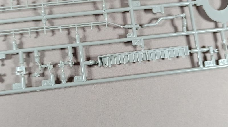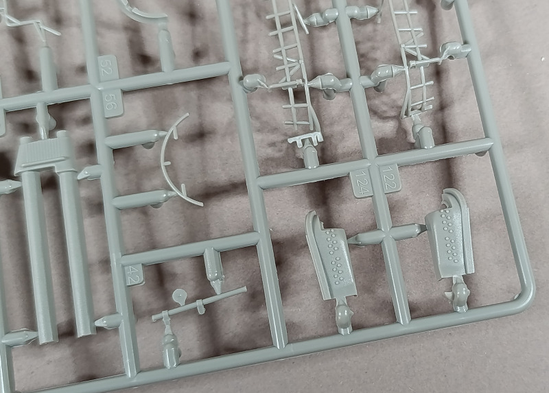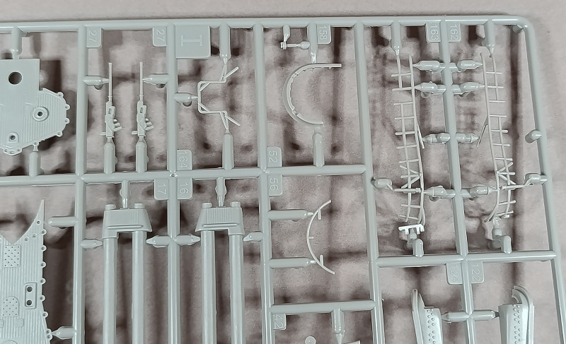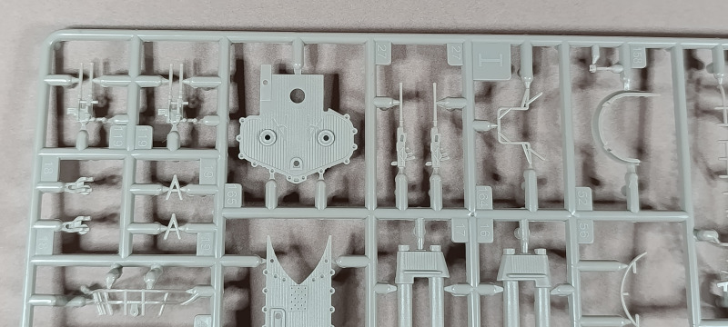 Der Turm ist zumindest laut dem Detailset-Hersteller RC-Subs nicht ganz korrekt dargestellt. Offenbar hat Revell sich hier an der U-505 orientiert, wodurch einige Details nicht exakt zur U-190 passen. In diesem Zusammenhang stellt sich durchaus die Frage, warum man nicht direkt die U-505 umgesetzt hat. Unabhängig davon weiß das Gebotene jedoch zu gefallen. Die Oberflächenstrukturen sind fein dargestellt. Die Seitenteile sind mittig geteilt und werden zusammengesetzt, das obere und untere Turmdeck separat eingeklebt, auch hier überzeugt die Struktur. Weniger gelungen sind die fehlende Darstellung des Sterns an den Flak-Geschützen sowie die etwas zu massiv ausgeführten Halterungen für das Balkongeländer. Die Turminnenseite liegt separat bei, ebenso Luken, Leiter und Rettungsring. Auch Periskope und Funkmasten sind enthalten. Der größte Kritikpunkt ist jedoch das FuMO 30-Radar (Bauteil J34). Die Darstellung wirkt nach heutigen Maßstäben deutlich zu grob und zieht meiner Meinung nach das Gesamtergebnis spürbar herunter. Hier empfiehlt sich auf jeden Fall ein Austausch durch ein filigraneres Ersatzteil.