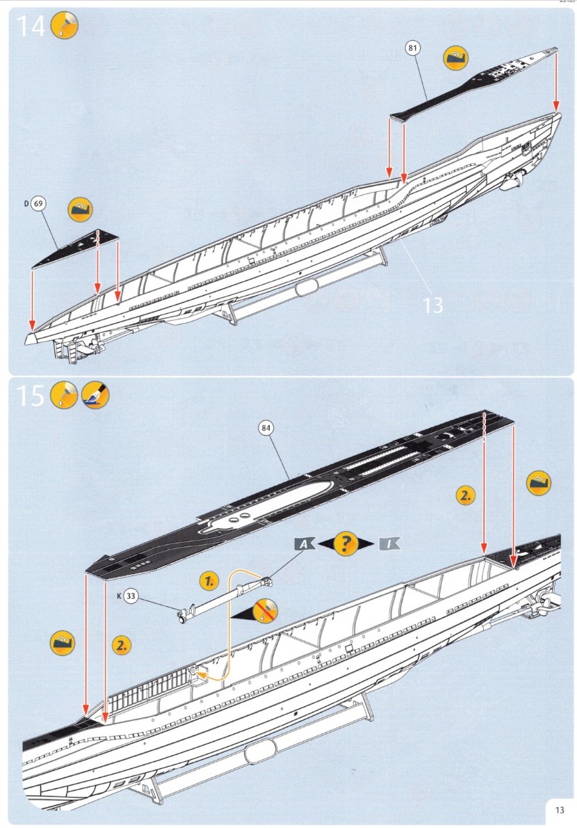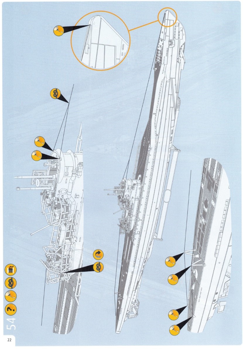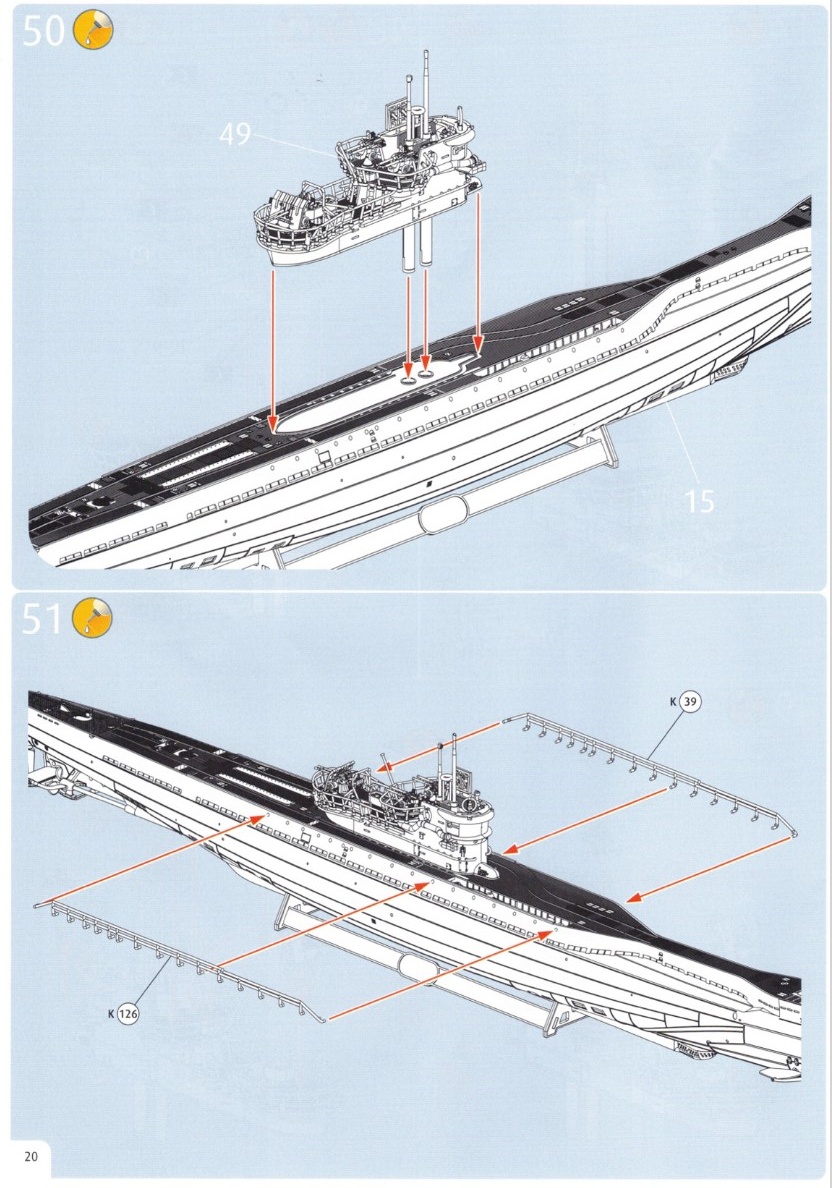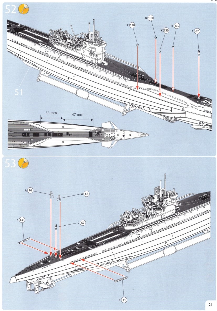 Anleitung:Mit der klassischen Revell-Anleitung gibt es im Grunde keine Probleme. Insgesamt sind 54 Bauschritte notwendig, bis ein fertiges U-Boot auf dem Tisch steht. Bei der Bemalung empfiehlt sich jedoch eine eigene, vertiefte Recherche, um ein möglichst stimmiges und vorbildgerechtes Ergebnis zu erzielen.