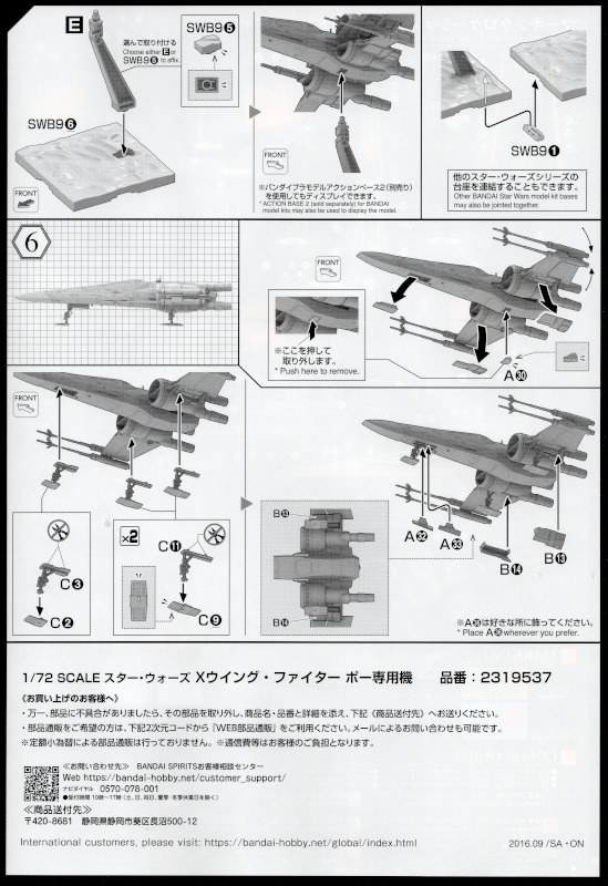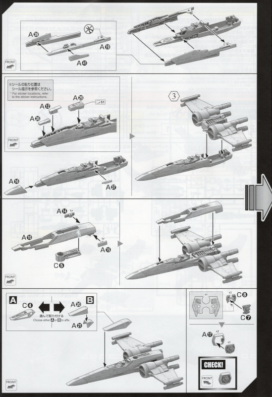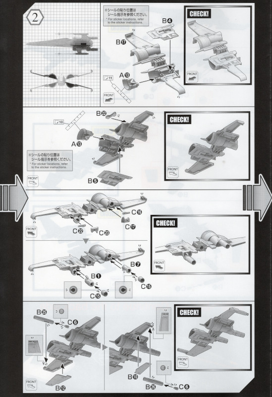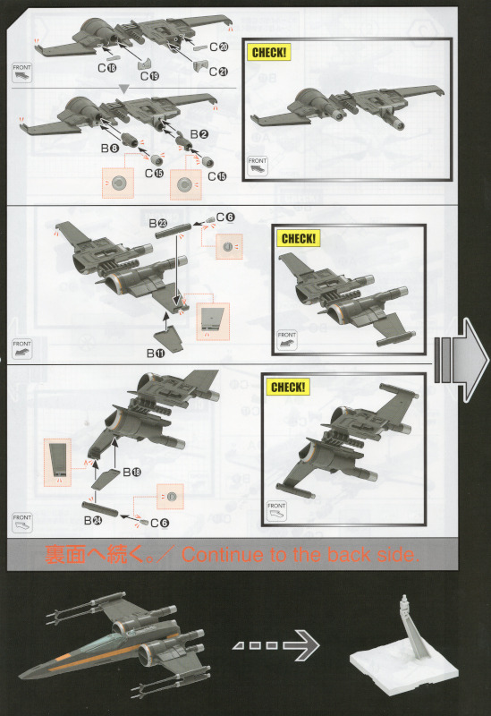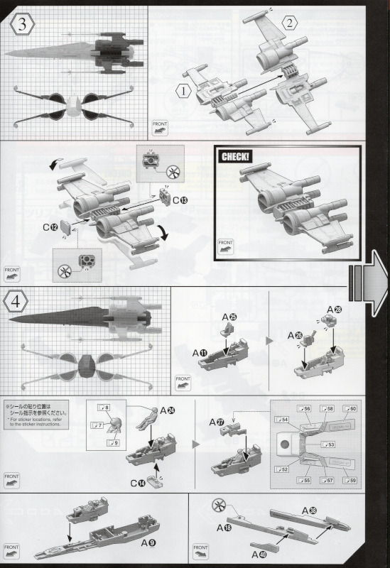 Der MarkeirungsbogenWie auch bei den vorherigen Star Wars-Bausätzen von Bandai liegen die Markierungen als Aufkleber und als Decals bei. Der Decalbogen ist matt und augenscheinlich ohne Fehler gedruckt. Sehr gut ist es das die Lackierung der Streben der Cockpitverglasung als Decals beiliegen. Das erspart eine Maskieren der Klarteile und das Lackieren mit Farben. Außerdem sind eine ganze Reihe von Wartungshinweisen enthalten.