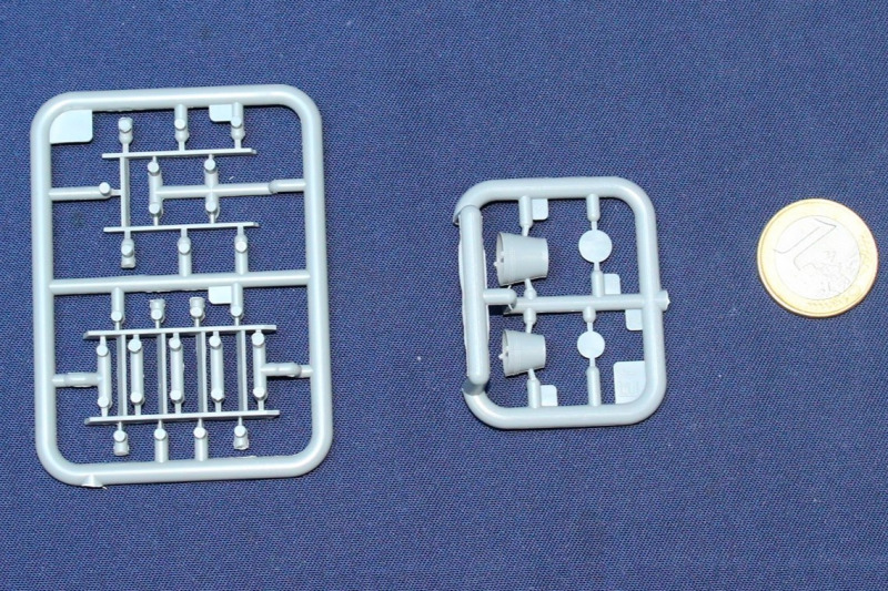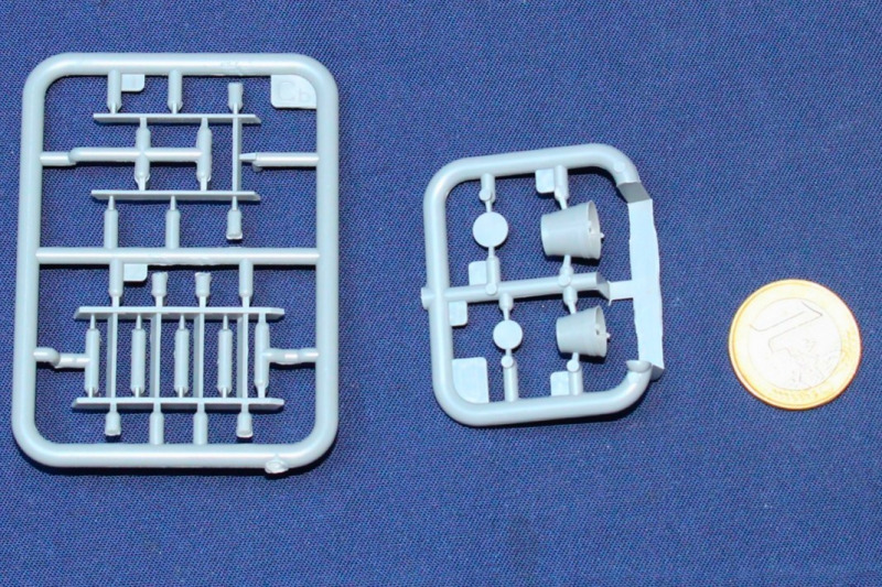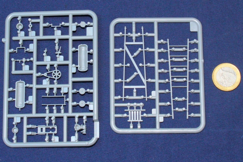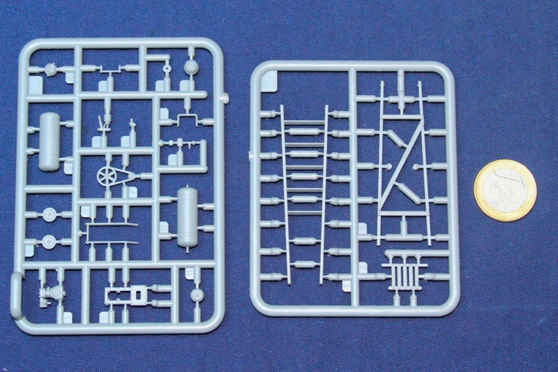An sechs kleinen Spritzlingen befinden sich Teile für zwei Wehrmachtssoldaten und entsprechendes Zubehör, das sie bei Malerarbeiten zeigt. Dabei sind die Figuren lebensecht und ausdrucksstark modelliert, das Zubehör sehr fein und filigran ausgeformt. Detailreichtum und besonders der Faltenwurf überzeugen. Den bei Spritzguss üblichen Auslöse- und Versäuberungsaufwand muss man einplanen. Nicht gerade wenig! Sorgfalt zahlt sich dabei aber aus.