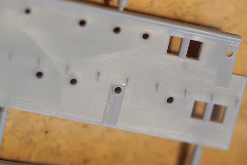 Hand bzw. den Bohrer anlegen sollte man an den am Deck angegossenen Aufbautenwänden, hier sind keinerlei Bullaugen, Fenster oder Türen nachgebildet. Die Bemalungsanleitung hilft bei der Eigeninitiative etwas weiter (ebenso wie die Vorbildfotos auf o.g. Webseite). Die Fensteröffnungen an Brücke und Rumpf sind bausatzseitig bereits durchbrochen, Material für eine „Verglasung“ liegt jedoch nicht bei; ebensowenig wie Takelgarn: hierfür sind aber an den entsprechenden Teilen die benötigten Löcher bereits angelegt.