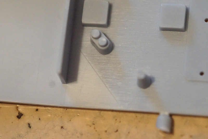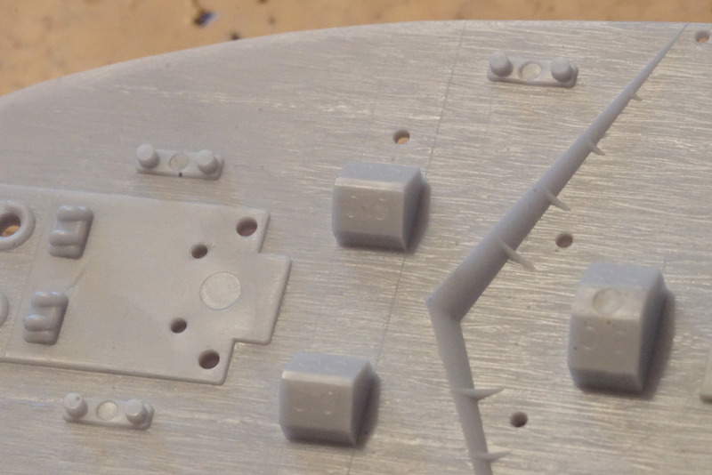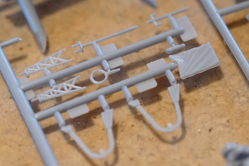 Manches, wie beispielsweise die Winden, ist vereinfacht dargestellt. Auch an den Aufbauten und den Radar- und Funkantennen auf dem Brückendach lässt die Detailtiefe etwas zu wünschen übrig, aber grundsätzlich kann man durch eine entsprechende Bemalung schon etliches herausholen. Manche Strukturen an den Aufbauten (beispielsweise die Fensteröffnungen in den Oberlichtern) sind seeehr dezent wiedergegeben, hier ist eine ruhige Hand, die den Pinsel führt, fraglos von Vorteil. Als ein Kuriosum aus der Entstehungszeit des Bausatzes darf Teil Nr. 21 betrachtet werden: eine wehende Flagge mit ordentlicher Materialstärke, die selbst bemalt werden darf; ein Decal dafür gibt es nicht.