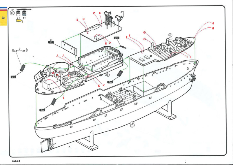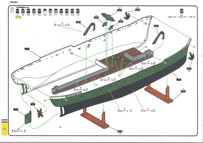Abschließend gibt es die Bemalungs- und Dekorationsanleitung für beide Schiffe – allerdings nur für die Steuerbordseite und die Draufsicht -, wobei Marie-Jeanne das etwas farbenfrohere ist. Zu beachten sind unbedingt die Decals 1/2 bzw. 6/7 (Namenszüge und Registrierungen): nach Vorbildfotos steht bugwärts der Namenszug, dann die Registrierung; dies bedeutet also eine (entgegen der Anleitung) seitengetauschte Anbringung der Bilder. Weitere Aufmerksamkeit erfordert der beschriebene weiße Rumpfabschluss am Heck: denkt man sich diese Angabe auf die Backbordseite weiter, müsste logischerweise der weiße Streifen – durch den Umbau bedingt – bis ins vordere Backbordviertel des Rumpfes gezogen werden: sieht recht seltsam aus. Ein farbiges Vorbildfoto von Volontaire zeigt jedoch, dass es in diesem Bereich keinen weißen Absatz gab und die dunkelgrüne Rumpffarbe bis an die Deckskante hochgezogen war – Problem gelöst. Die Farbangaben beziehen sich allein auf die Heller-Palette.