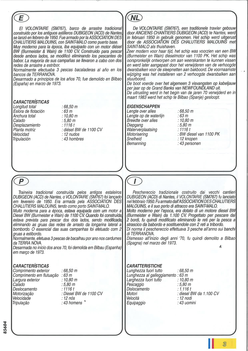 Marie-Jeanne und Volontaire sind (der Bauanleitung nach) Schwesterschiffe, die auf der Werft Anciens Chantiers Dubigeon (ACD) in Nantes gebaut wurden. Volontaire (SM.767) wurde nach der Ausrüstung bei Association des Chalutiers Malouins im Februar 1950 abgeliefert, der Heimathafen war Saint Malo, der Betreiber die Association des Tralutiers Malouins. Modern für die damalige Zeit war die Ausstattung mit einem 1.100 PS Dieselmotor von Burmeister & Wain. Ursprünglich war das Schiff so konzipiert, dass von beiden Seiten gefischt werden konnte, bei einem Umbau hat man aber die Backbord-Schleppnetzausleger entfernt. Üblicherweise wurden drei Fischzüge pro Jahr auf Kabeljau zu den Neufundlandbänken gefahren. Im Jahr 1970 wurde die Volontaire stillgelegt und im März 1973 in Bilbao (Spanien) abgewrackt. Vorbildfotos von Volontaire findet man hier. Über die Marie-Jeanne ist nichts dergleichen dokumentiert, verschiedenen Quellen zufolge darf man sie als „Fantasiegebilde“ einordnen. Man kann dieses Schiff jedoch - ohne konkretes Vorbild - als Beispiel für diesen damals an der französischen Atlantikküste offenbar häufig zu sehenden Schiffstyp betrachten, wobei der Umbau zum Fischen allein von der Steuerbordseite aus in Frage gestellt werden darf; der Ansatz zu einem entsprechenden „Rück“bau ist hier (weiter unten) zu sehen.