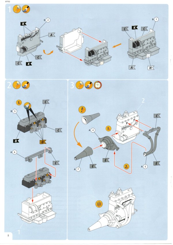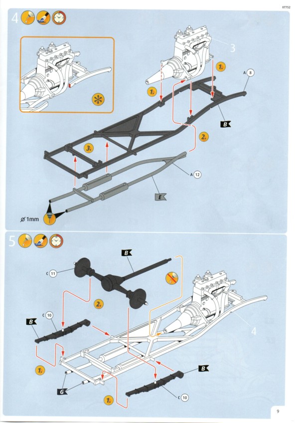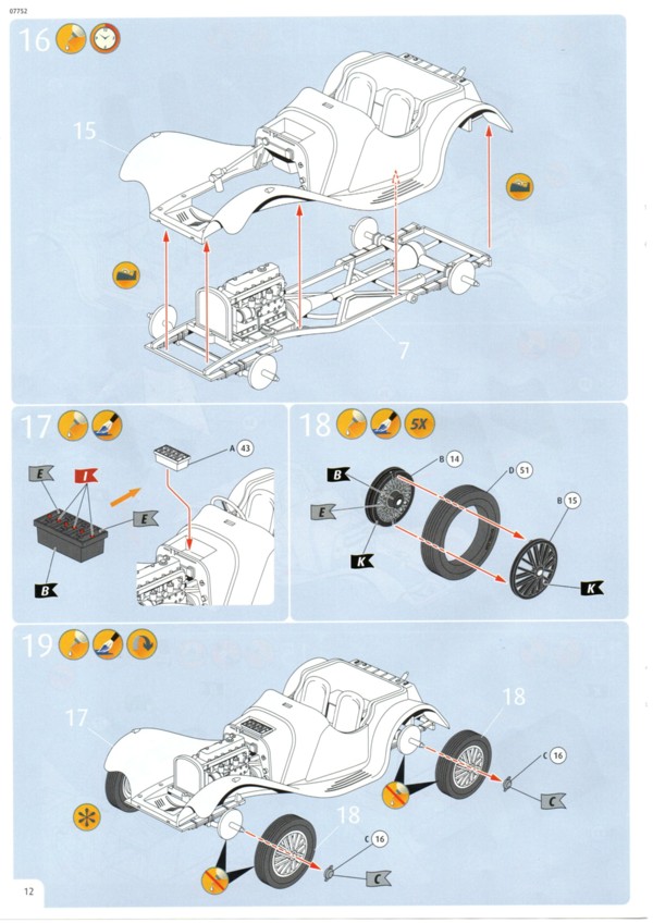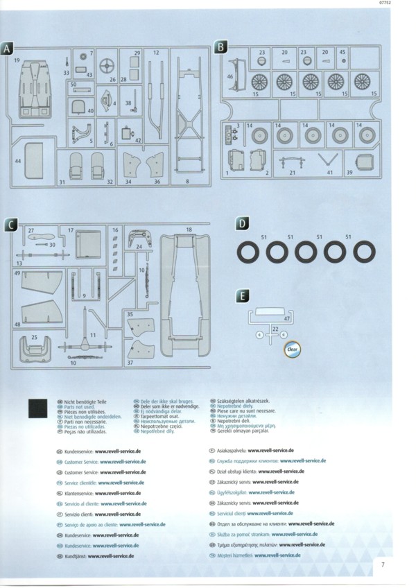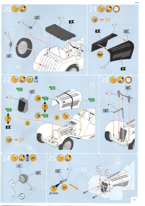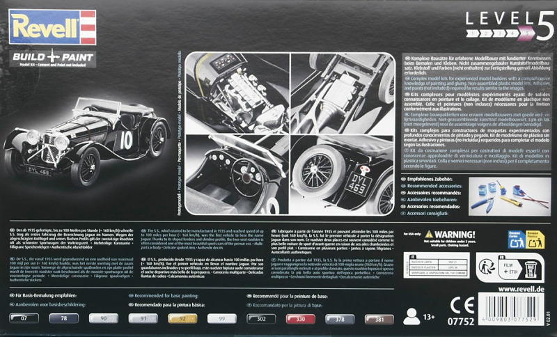 Der Decalbogen ist sehr übersichtlich ausgefallen. Gerade einmal 15 einzelne Decals sind auf dem sauber gedruckten Bogen enthalten. Die Teile für den Kühlergrill und den Riemen der Motorhaube hätte man auch weglassen können. Was Decal 7 darstellen soll erschließt sich mir nicht so ganz. Auf Originalfotos ist nichts Derartiges zu erkennen. Die Bauanleitung ist wie üblich sehr übersichtlich und hier auch nicht allzu umfangreich. Warum Revell den Bausatz mit dem Schwierigkeitsgrad 5 einstuft ist nicht ganz nachvollziehbar. Das Fahrzeug dass sich Revell zum Vorbild genommen hat existiert tatsächlich. Es ist ein Modell 1937 und trägt die Fahrgestellnummer 18105. Es wurde seinerzeit als Rennfahrzeug eingesetzt und gehörte Bob Truett, einem recht erfolgreichen Amateurrennfahrer aus London. Der Wagen wurde mit einigen Modifikationen versehen und konnte gut mit den stärkeren 3,5L Fahrzeugen mithalten. Es gibt eine ganze Reihe von Fotos im Internet an denen man sich für eine exakte Replik orientieren kann. Streng genommen müsste man für dieses spezielle Fahrzeug einige Dinge ändern, wie z.B. die Abgasrohrführung und die Bohrungen zur Gewichtsersparnis am Rahmen. DYL 469 ist komplett Schwarz, innen wie außen. Da muss man mit verschiedenen Schattierungen und Glanzgraden spielen um etwas Leben in das Modell zu bringen. Darstellbare Fahrzeuge: