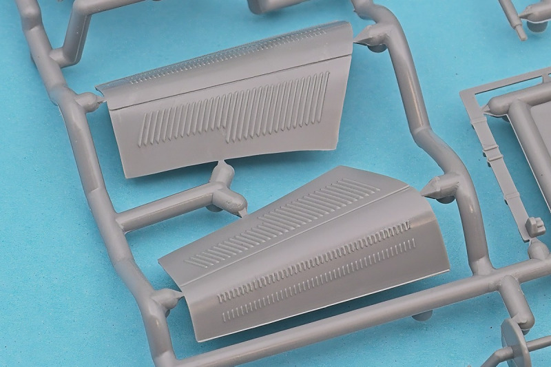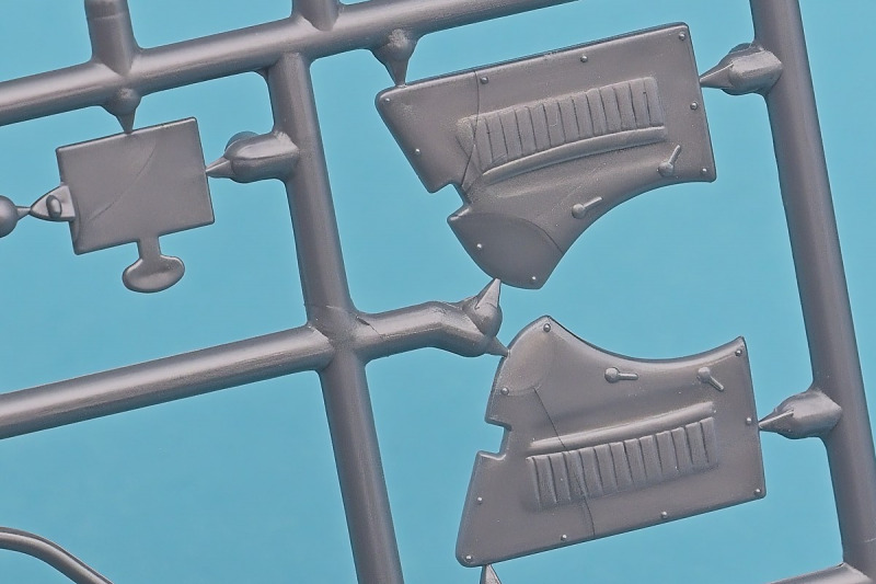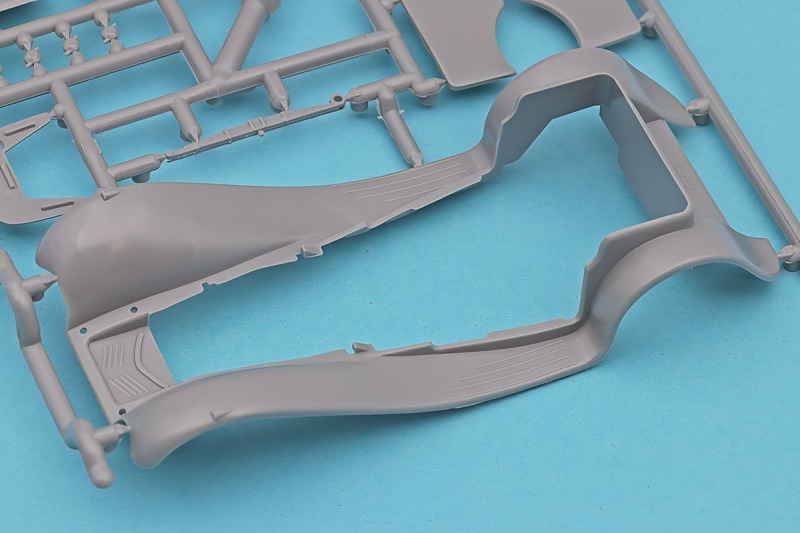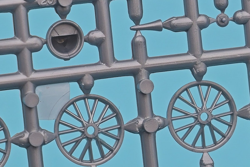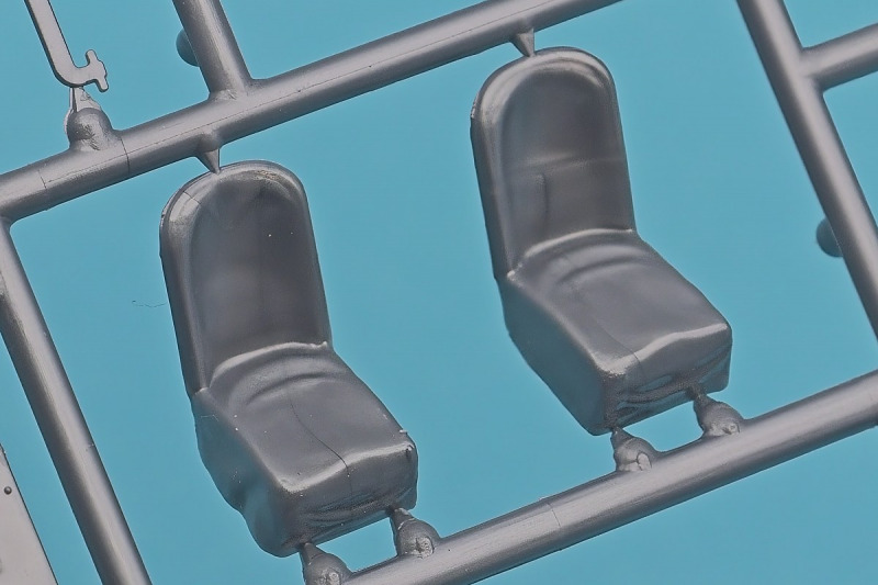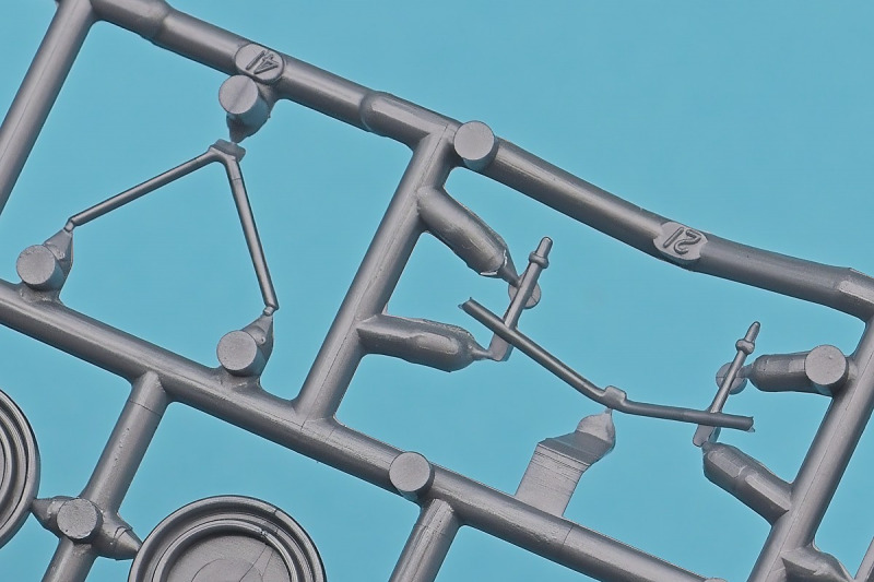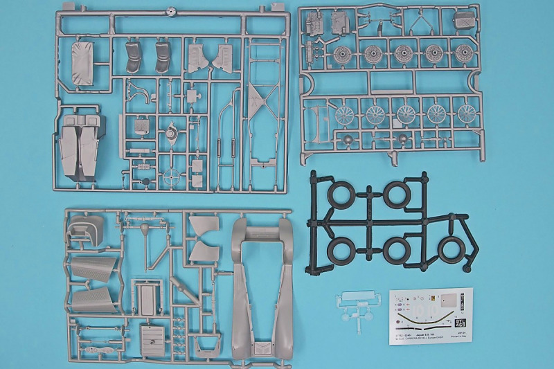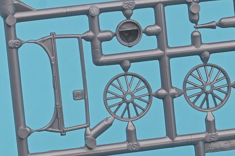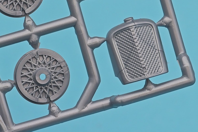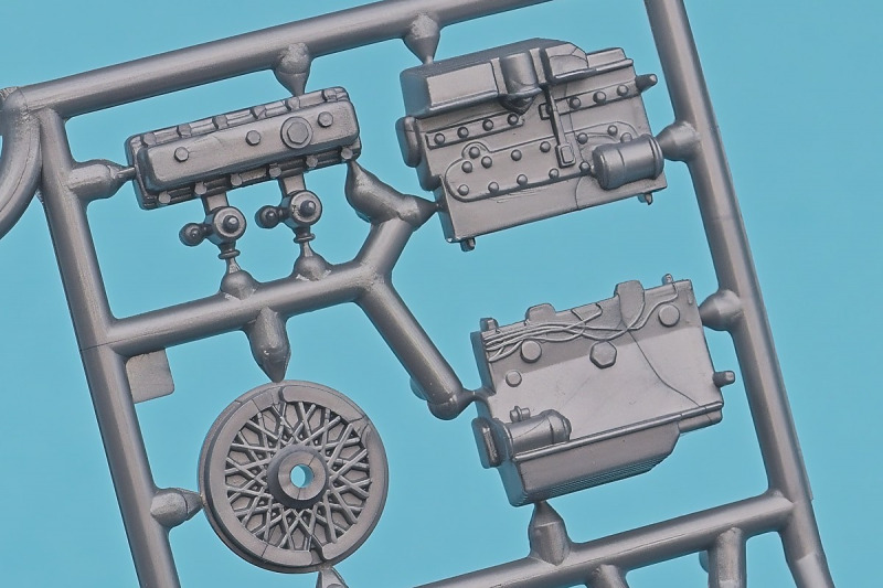 Die knapp über 70 Bauteile wirken beinahe etwas verloren in der Schachtel. Die Gussqualität ist recht gut, bis auf den üblichen Grat gibt es hier nichts anzumerken. Der Zusammenbau beginnt mit dem aus sieben Teilen bestehenden Motor. Dieser kann später am Modell noch gezeigt werden da die Motorhaube nur aufgelegt wird. Natürlich ist dies sehr vereinfacht, denn beim Original sind das vier, mit Klavierbändern verbundene Einzelsegmente. Das in 1:32 beweglich zu machen dürfte eine spannende Herausforderung sein. Den Riemen, hier als Decal kann man weglassen, den sieht man am Original so gut wie nie (die Haubenteile werden durch Rändelschrauben fixiert). Der Rahmen ist einteilig und man braucht nur die aus jeweils drei Teilen bestehenden Achsen mit den Blattfedern anzubauen. Die Räder können später drehbar aber nicht lenkbar angebaut werden. Die Speichenräder sind sicherlich ein Schwachpunkt am Modell. Besser war das seinerzeit aber nicht zu machen. Da hilft es dass die Speichen am Ende schwarz bemalt werden. Die Reifen sind aus Weichplastik und müssen ein wenig bearbeitet werden da es etwas Grat an den Kanten gibt. Den Dunlop Schriftzug gibt es nur auf einer Seite. Der Innenraum ist sehr schön wiedergegeben. Es gibt unterschiedliche Texturen für die mit Teppich belegten Bereiche. Die Sitze weisen einen einfachen Faltenwurf auf und es gibt ein paar erhabene Details an den Türverkleidungen. Die Türen selbst sind separat ausgeführt, können aber nicht beweglich angebaut werden. Das Armaturenbrett hat erhaben geprägte Instrumente für die auch ein passendes Decal vorhanden ist. Ein paar Anbauteile vervollständigen das Modell. Die Scheibe sollte man durch eine passende Folie austauschen da sie nicht ganz schlierenfrei ist. Die Gitter vor den Scheinwerfen sind mit auf den Leuchtengläsern, auch keine ideale Lösung.