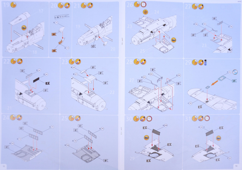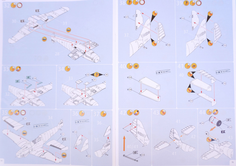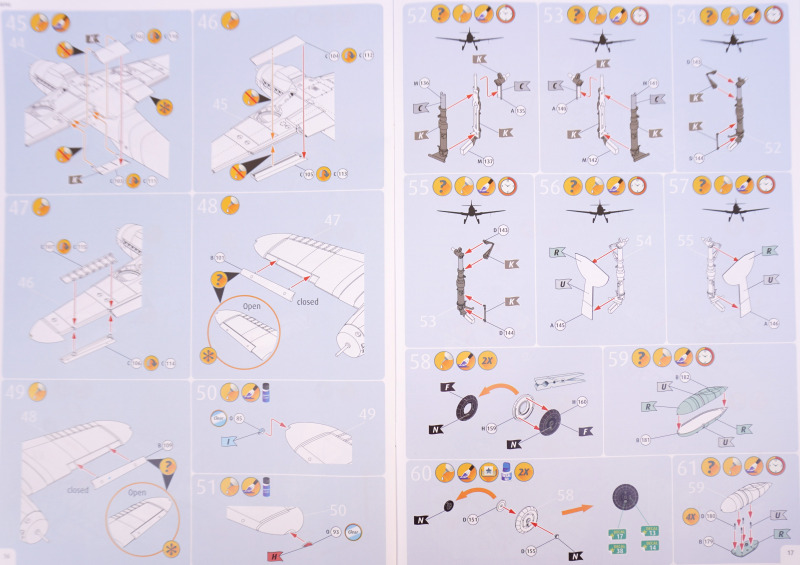 - Es fehlen Hinweise, welche der beiliegenden Bauteil-Variantenfür welche Markierungsoption korrekt sind, beispielsweise die Montage zweier verschiedener Seitenruder in Baustufen 38 und 39 (Spritzlinge M bzw. N) oder die Erlauhauben Bauteile 58 bzw. 59 in Baustufe 67.