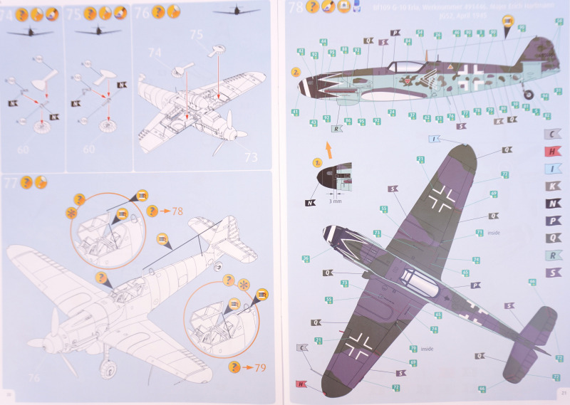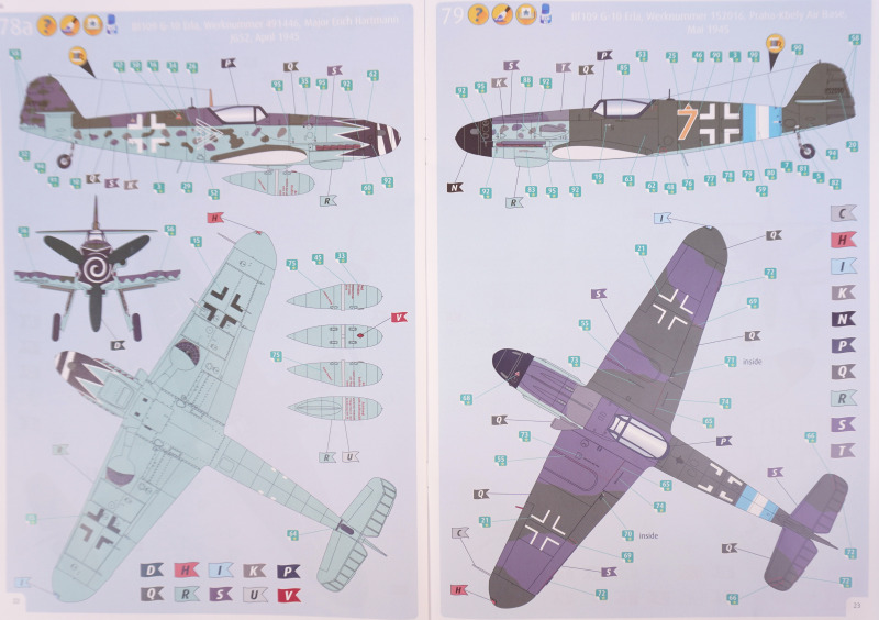 Bei der Werknummer 491446, Maj. Erich Hartmann, JG 52, April 1945, wird laut Anleitung eine Lackierung aus RLM 75 Grüngrau und RLM 83 Dunkelgrün über RLM 76 Hellblau empfohlen, was nach Angaben mehrer "Experten" im Netz auch authentisch zu sein scheint. Die gewählten Farbtöne für die zweite darstellbare Maschine, W.Nr. 152016, JG 300, Prag-Kbely, Mai 1945, scheinen ebenfalls passend zu sein.