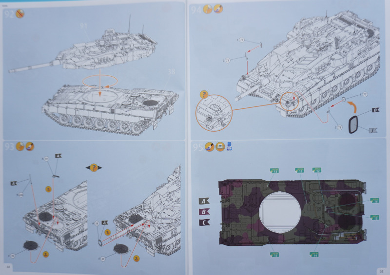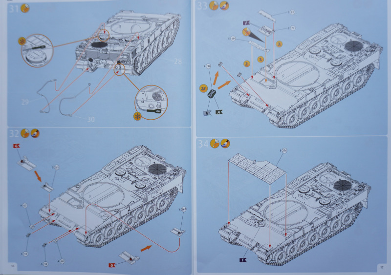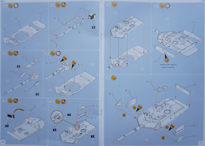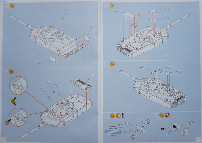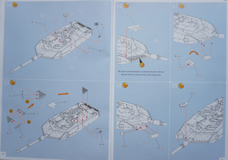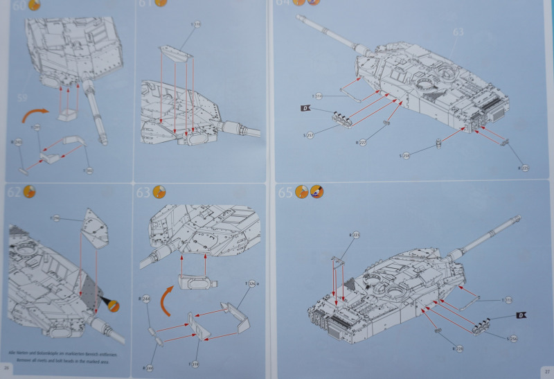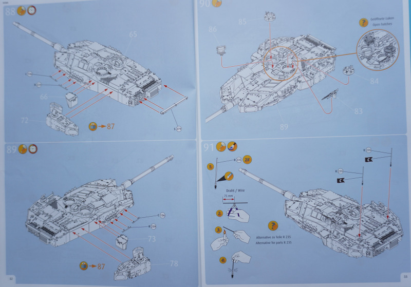 Besonderheiten beim BauAuf der Vorderseite der Bauanleitung ist ein etwa zehn Zentimeter langes Stück Metalldraht befestigt. Es dient in Baustufe 92 zur Darstellung der Funkantennen - die Bausatzteile R235 sollen um die angegossene Antennensehne gekürzt und stattdessen der Metalldraht durch Erhitzen in den jeweiligen Antennenfuß "hineingeschmolzen" werden. Der beiliegende Acetatbogen (Klarsichtmaterial) soll zurechtgeschnitten und als Verglasung des Kommandanten-Periskops (Baustufe 52) sowie der beiden Besatzungs-Schutzschilde ("crew shields") in den Baustufen 71 und 80 eingesetzt werden. Die crew shields wiederum werden zwischen Turmluken und der Werfereinheit des Trophy montiert und sind ein markantes optisches Merkmal des Leos 2A7A1 auf den Turmoberseiten. Die Abschleppseile am Spritzling D aus Vinyl liegen nur der Form halber bei - sie werden komplett durch die Teile R 240 und 247 bis 249 ersetzt. Diese filigran wirkenden Polystyrolseile wirken etwas realistischer als diejenigen aus Vinyl. Nur eine Frage: warum hat Revell die beiden Vinyl-Spritzlinge D überhaupt in die Box gepackt? Sie bleiben komplett unbenutzt. Kein Problem sehe ich bei der Verwendung des zweiteiligen Kanonenrohrs: wer hier nach dem Verkleben der beiden Rohrhälften die Klebenaht sauber bearbeitet und einen eventuell entstehenden Grat beseitigt, wird kein einteilig gegossenes Tuningteil des Aftermarkets benötigen. Detailfreaks werden nicht out of the box dargestellte Feinheiten an den Bauteilen des Kits durch Scratchbau oder Fotoätzteile ergänzen: Haltekettchen der Nebelbecher, Verzurrungen der Abschleppschäkel, Lampenschutzbügel des Leitkreuzes. Auf geht es, liebe Leo-Fans!