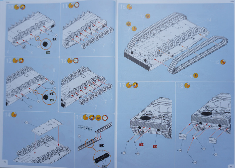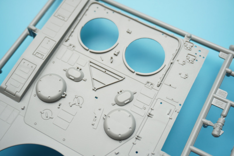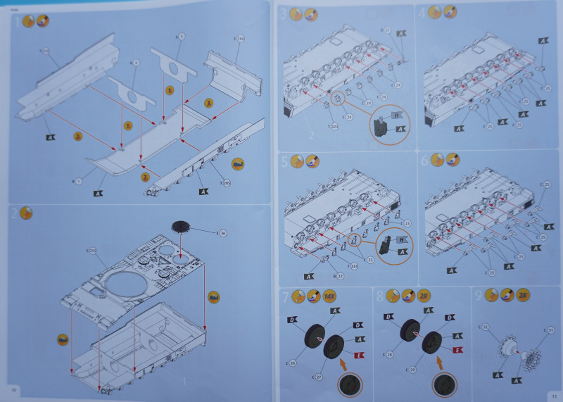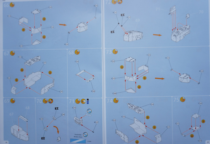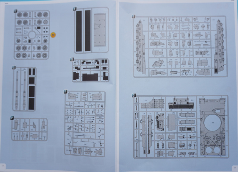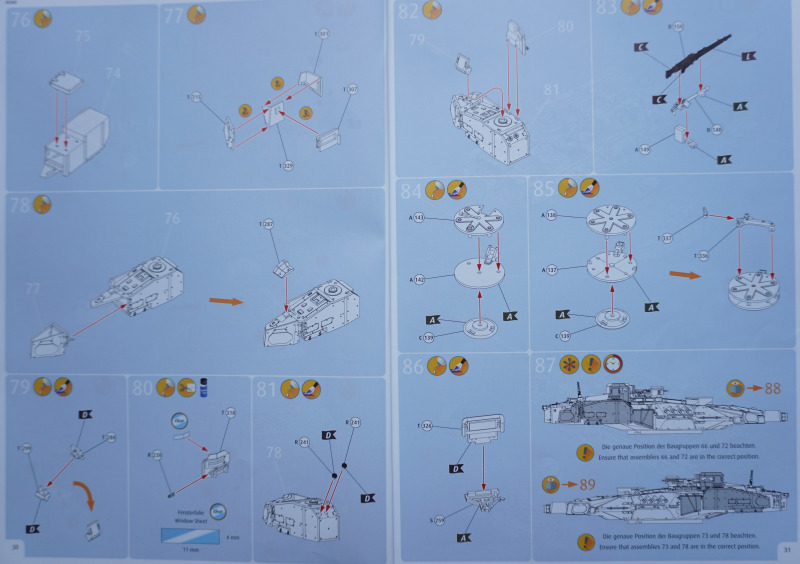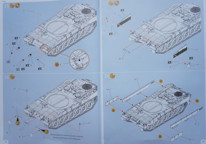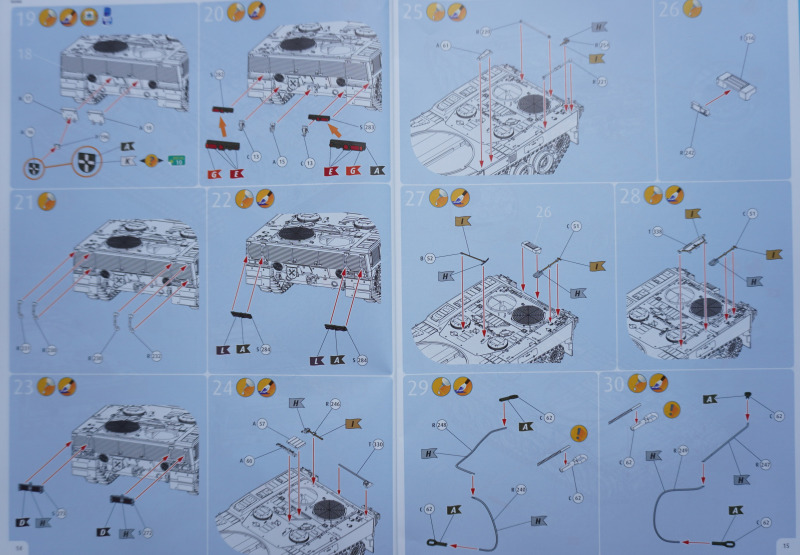 Besonderheiten beim BauAuf der Vorderseite der Bauanleitung ist ein etwa zehn Zentimeter langes Stück Metalldraht befestigt. Es dient in Baustufe 92 zur Darstellung der Funkantennen - die Bausatzteile R235 sollen um die angegossene Antennensehne gekürzt und stattdessen der Metalldraht durch Erhitzen in den jeweiligen Antennenfuß "hineingeschmolzen" werden. Der beiliegende Acetatbogen (Klarsichtmaterial) soll zurechtgeschnitten und als Verglasung des Kommandanten-Periskops (Baustufe 52) sowie der beiden Besatzungs-Schutzschilde ("crew shields") in den Baustufen 71 und 80 eingesetzt werden. Die crew shields wiederum werden zwischen Turmluken und der Werfereinheit des Trophy montiert und sind ein markantes optisches Merkmal des Leos 2A7A1 auf den Turmoberseiten. Die Abschleppseile am Spritzling D aus Vinyl liegen nur der Form halber bei - sie werden komplett durch die Teile R 240 und 247 bis 249 ersetzt. Diese filigran wirkenden Polystyrolseile wirken etwas realistischer als diejenigen aus Vinyl. Nur eine Frage: warum hat Revell die beiden Vinyl-Spritzlinge D überhaupt in die Box gepackt? Sie bleiben komplett unbenutzt. Kein Problem sehe ich bei der Verwendung des zweiteiligen Kanonenrohrs: wer hier nach dem Verkleben der beiden Rohrhälften die Klebenaht sauber bearbeitet und einen eventuell entstehenden Grat beseitigt, wird kein einteilig gegossenes Tuningteil des Aftermarkets benötigen. Detailfreaks werden nicht out of the box dargestellte Feinheiten an den Bauteilen des Kits durch Scratchbau oder Fotoätzteile ergänzen: Haltekettchen der Nebelbecher, Verzurrungen der Abschleppschäkel, Lampenschutzbügel des Leitkreuzes. Auf geht es, liebe Leo-Fans!