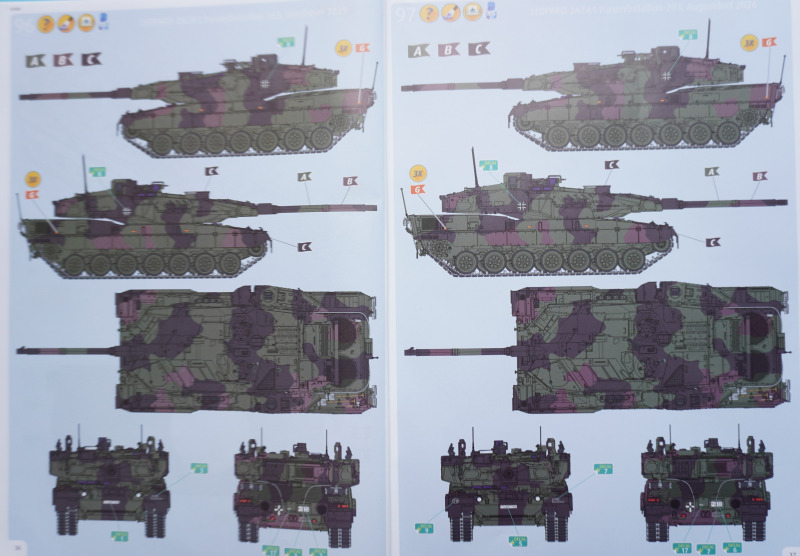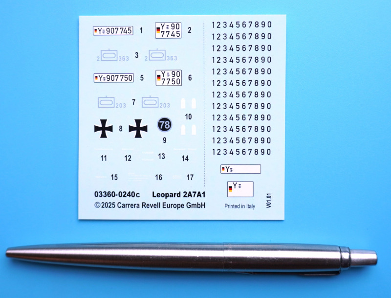 MarkierungsmöglichkeitenDer Bausatz enthält Decals für die zweite Kompanie des Panzerbataillons 363, stationiert in Hardheim (2025), sowie ein Fahrzeug des Panzerbataillons 203, stationiert in Augustdorf (2026). Neben den beiden Fahrzeugkennzeichen sind zwei "Blanko"-Nummernschilder mit einzelne Ziffern für die Darstellung eines jeden denkbaren Kennzeichens enthalten.
