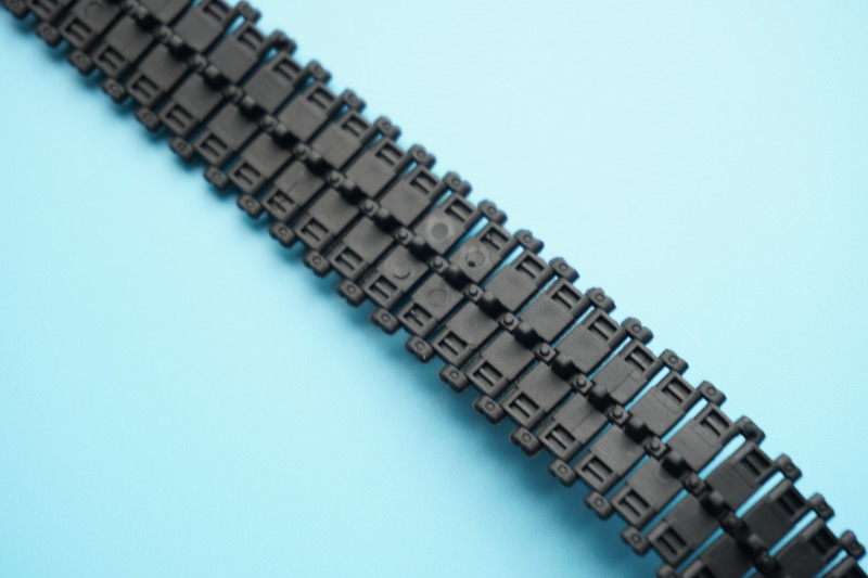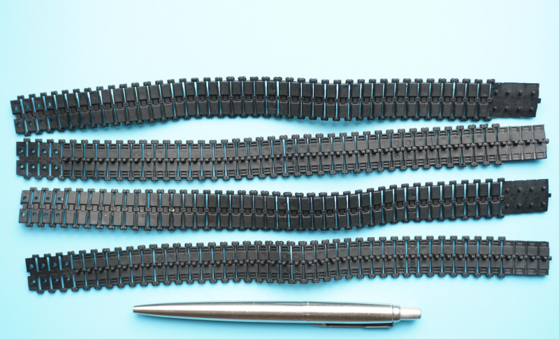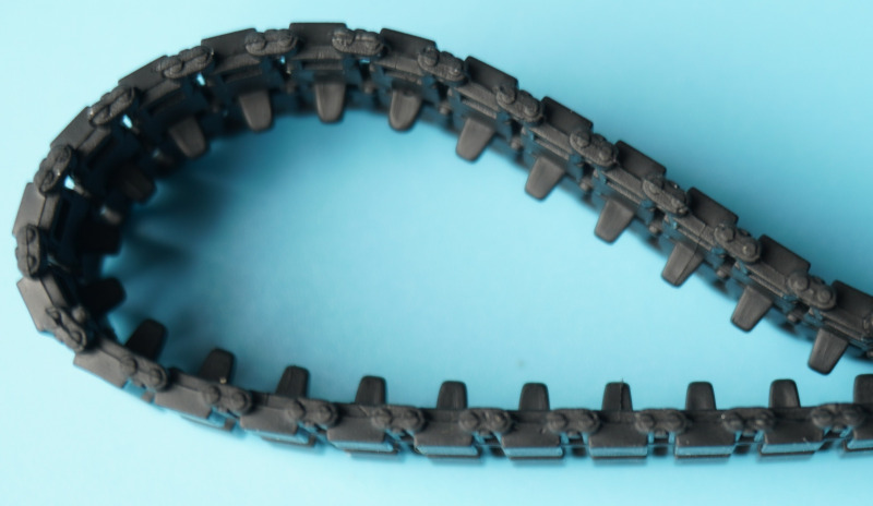 Ein Schmuckstück? Die PanzerketteLeider sind im Revell-Kit anstelle von gegossenen Segment-Panzerketten, die mittlerweile bei zahlreichen Panzer-Kits der fernöstlichen Modellbaukonkurrenz standardmäßig zu finden sind, zwei jeweils zweiteilige Vinylketten enthalten, die durch Verschmelzen/Verkleben der Noppen in gelochte Gegenstücke verbunden werden. Ich habe immer gemischte Gefühle bei diesen Weichplastikteilen: werden sie über die Jahre beständig bleiben oder irgendwann anfangen, zu zerbröseln? Legen sie sich bündig auf Lauf- und Antriebsräder, ohne abzustehen? Werden die erkennbaren Gussnähte an den Kettenbolzen und auf einigen Laufflächen der Ketteninnenseiten auch nach dem Lackieren und Altern erkennbar sein? Fragen über Fragen, wobei zumindest beim Leo keine durchhängenden Effekte der Panzerkette á la WWII-Tiger, Panther oder Elefant etc. erforderlich sind: die Panzerkette des Leos ist stets straff gespannt und verschwindet bei der Montage eh hinter den Seitensschürzen, wodurch beim fertigen Modell nur die untere Hälfte der Kette zu sehen sein wird. Was leider immer noch nicht ganz passt: die Laufflächen sind immer noch quadratisch, und nicht originalgetreu asymmetrisch mit leichtem Versatz geformt. Je länger ich so drüber nachdenke, werde ich mir wohl als Alternative eine Segmentkette aus Polystyrol des Aftermarkets (z.B. die Diehl-Kette von Rye Field Model RM-5057) zur Seite legen.