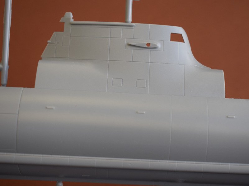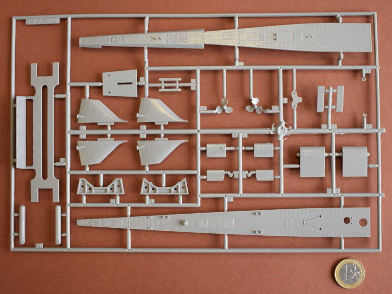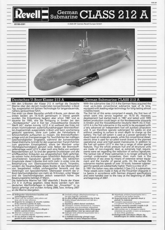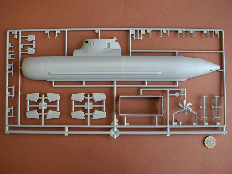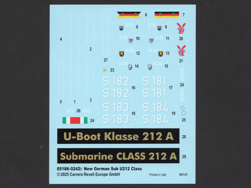 Type 212ADie U-Boote dieses Typs sind die weltweit ersten, die mit einem Brennstoffzellen-Antrieb ausgerüstet sind und unabhängig von Außenluft fahren können. Alternativ können auch Elektro- oder Dieselmotoren den Antrieb übernehmen. Durch den Einsatz der Brennstoffzelle sind diese U-Boote unter Wasser die leisesten der Welt. Seit 2002 wurden 10 Einheiten in zwei Baulosen gebaut. Darunter sechs für die deutsche Marine und vier für die italienische Marine. Weitere Versionen für den Export (Klasse 214, 216 und 218) werden derzeit unter deutscher Federführung in Griechenland, Türkei, Südkorea und Singapur gebaut. Man kann also durchaus von einem erfolgreichen U-Boot-Konzept sprechen. Revell hat als einzige Firma ein Type 212A als Spritzgussbausatz in 1:144 im Sortiment. Die Erstauflage war im Jahr 2005, und 2014 folgte die erste Wiederauflage. An den Bauteilen sind nur wenige Unsauberkeiten zu finden. Diese sind jedoch leicht und schnell zu enfernen. Vergleicht man Originalfotos mit dem Modell, so wirken die versenkten Gravuren etwas zu breit bzw. tief. Einige Bohrlöcher müssen selbst gesetzt werden. Es gibt auch wieder die Optionen die Periskope, Antennen und Messfühler auf der Oberseite des Turms auf- oder eingefahren darzustellen. Auch die beiden Türen können offen oder geschlossen montiert werden. Der Faden für die Antennendrähte muß aus eigenen Beständen verwendet werden. Auch bei diesem Modell ist ein Displayständer enthalten.