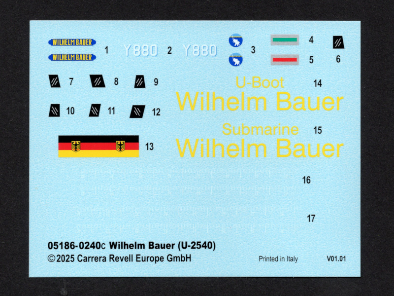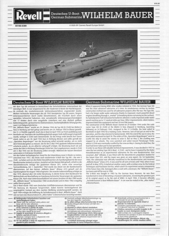 BesprechungDas SetZum 70jährigen Bestehen der Bundeswehr hatte Revell bereits für die Luftwaffe und das Heer Sonderauflagen von passenden Bausätzen wieder auf den Markt gebracht. Das vorliegende Set mit der Nummer 05186 ist der Marine gewidmet und hier im Speziellen den Unterseeboote. Warum man nicht Überwassereinheiten für dieses Set verwendet hat ist mir unklar, zumal diese in ihrer Anzahl stärker vertreten sind. Wie dem auch sei, der Modellbauer wird sich über drei Bausätze freuen, da es sie schon seit einigen Jahren nicht mehr im Handel gab. Der große und recht instabile Stülpkarton enthält drei Bausätze, die hier in einer Zusammenfassung vorgestellt werden sollen. Im Detail wurden diese in der Vergangenheit bereits vorgestellt. Wer sich zu den jeweiligen Originalen selbst informieren möchte findet im Internet problemlos ausführliche Hintergründe. Deutsches U-Boot WILHELM BAUERDiese U-Boot wurde gegen Ende von WK2 als Type XXI gebaut und als U-2540 von der DKM in Dienst gestellt. Nach der Kapitulation wurde es von der Besatzung selbstversenkt. 1957 wurde es gehoben und für die Bundeswehr umgebaut und als Erprobungsträger für neue Techniken in Dienst gestellt. Heute kann es als Museumsboot in Bremerhaven besichtigt werden. Dazu wurde es wieder zu U-2540 zurückgebaut. Der Bausatz wurde von Revell als Typ XXI-U-Boot erstmals 1992 auf den Markt gebracht. Die erste Version als WILHELM BAUER folgte 1995. Da der Bausatz in drei Versionen konzipiert war (Type XXI mit Vollrumpf, Type XXI mit Interieur und WILHELM BAUER) sind hier mehr Details enthalten bzw. sichtbar als benötigt werden. Durch den geschlossenen Rumpf sind diese später nicht mehr zu sehen. Die Ruder an Bug und Heck können beweglich montiert werden. Die versenkten und erhabenen Gravuren sind etwas zu stark ausgeprägt. Auf Originalfotos sind am Rumpf überwiegend erhabene Schweissnähte anstelle von versenkten Gravuren zu erkennen. Deswegen sollte gut überlegt werden wo ein „washing" gesetzt wird. Unsauberkeiten sind an den Bauteilen kaum zu finden. Ein paar Antennen und die Reling müssen selbst hergestellt werden. Auch einige Bohrlöcher müssen selbst gesetzt werden. Der Displayständer ist zwar keine Schönheit aber zweckmässig.