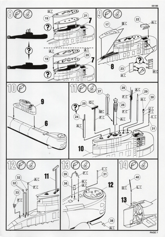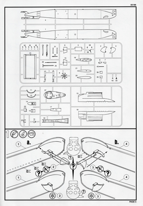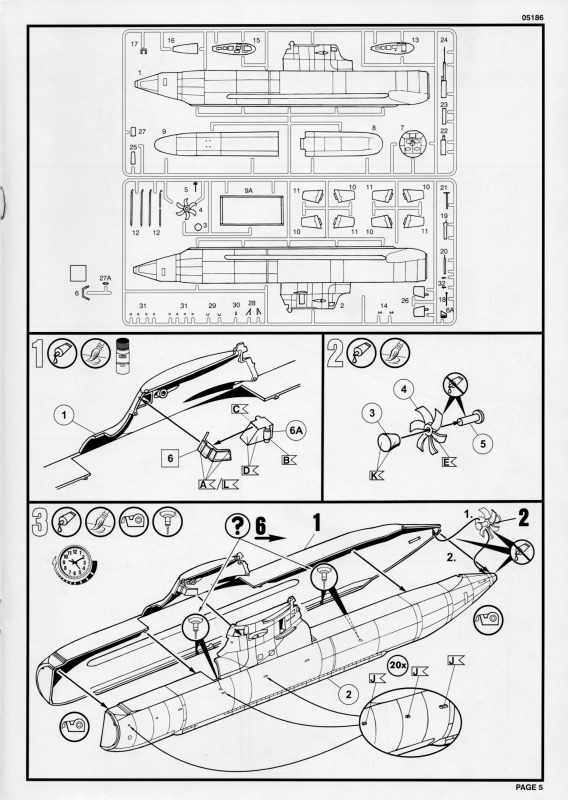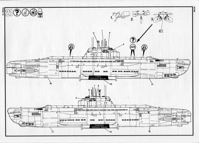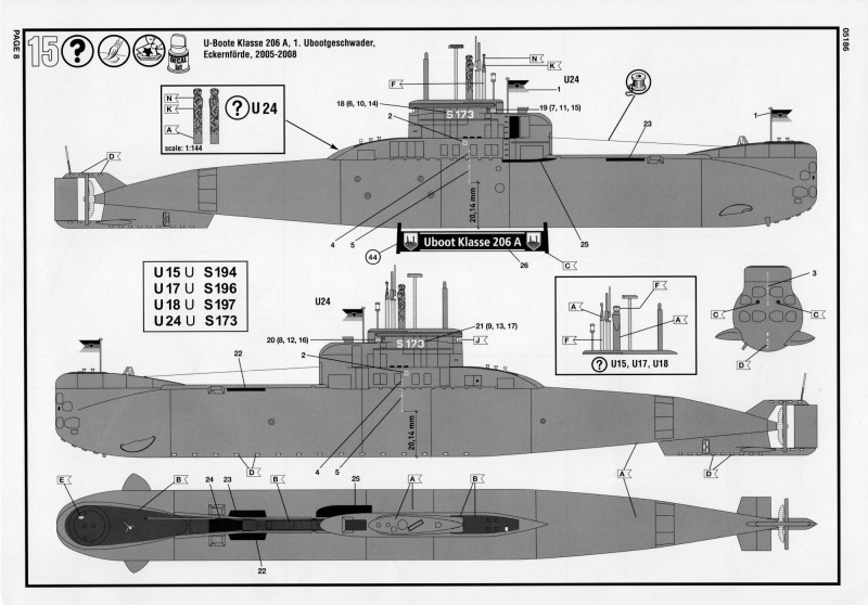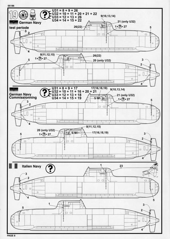 Die BauanleitungAuch diese Bauanleitung ist wieder in A4 und s/w gedruckt. Bis auf unwesentliche Details ist sie identisch zur Anleitung der vorherigen Auflage. Sie besteht aus acht Seiten und führt in 19 Schritten zum fertigen Modell. Der Markierungsbogen ist neu angeordnet und erlaubt die Darstellung der u.g. Unterseeboote der deutschen Marine während der Erprobung und nach der Indienststellung. Außerdem ist eine nicht spezifizierte Version der italienischen Marine möglich. Wie bei den anderen Bögen auch, so sind hier die Markierungen matt und augenscheinlich ohne Fehler gedruckt. Da die U-Boote seit einigen Jahren im Dienst sind kann es sein, dass die Markierungen in Größe und Platzierung sich inzwischen von den Bausatzvorlage unterscheiden. Wer also ein aktuelles Erscheinungsbild seines Modells bevorzugt, muß selbst recherchieren.