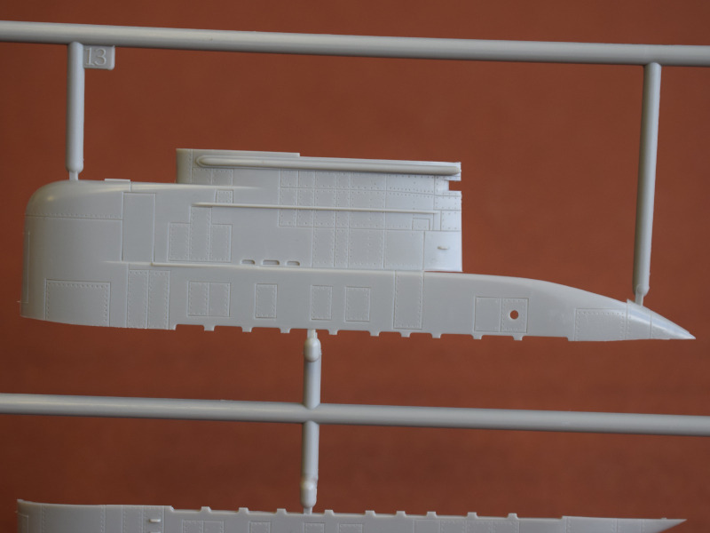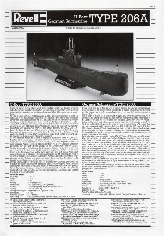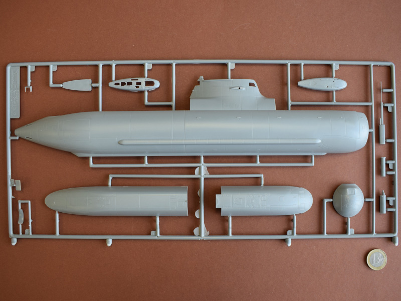Type 206AVon den Type 206-U-Booten wurden 18 Einheiten in Deutschland gebaut, und der erste Stapellauf fand 1971 statt. Charakteristisch für diese Boote war die Verwendung von nichtmagnetischem Stahl als Einhüllenboot und die Unterbringung des Sonars in einer Kuppel unter der dem Bug. Spektakulär war der Einsatz von U24 während der NATO-Übung JTFEX 01-2, die 2001 in der Karibik stattfand. Das sehr leise fahrende und damit schwer zu ortende U-Boot durchbrach den Ring der Sicherungsschiffe um den Atomflugzeuträger U.S.S. Enterprise. Es wurden mehrere simulierte Torpedos abgefeuert und das Schiff durch das Angriffssehrohr fotografiert. Anschließend tauchte U24 unangekündigt neben den Flugzeugträger auf. Der kommandieren U.S. General war nicht erfreut über das Versagen der U.S. Navy. Dem deutschen U-Boot und seiner Besatzung war eine außergewöhnliche Leistung gelungen. Einige Boote wurde zum Typ 206A umgebaut, einige verschrottet und zwei Stück nach Kolumbien verkauft wo sie seit 2015 im Dienst sind. Zwei weitere Boote sind noch in Kiel als Ersatzteilspender für die kolumbianischen Schiffe eingelagert. U17 gehört heute der Wehrtechnischen Studiensammlung (WTS) Koblenz und befindet sich als Dauerleihgabe im Technik-Museum Sinsheim. Nach der Erstauflage ist der Bausatz erst die dritte Wiederauflage von Revell. Kein anderer Hersteller hat die 206/206A als Spritzgussbausatz im Sortiment. Da die fast 30 Jahre alte Spritzform nicht oft verwendet wurde, sind so gut wie keine Unsauberkeiten an den Spritzrahmen zu erkennen. Der mitgelieferte Displayständer ist zweckmäßig. Der Modellbauer hat einige Optionen, um sein Modell darzustellen.