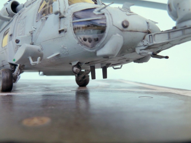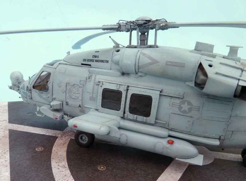 Bei dem von mir dargestellten HH-60H Rescue Hawk handelt es sich um eine der beiden Decalversionen des Bausatzes, die „schwarze 5“, No. 163786, HS-14 „Chargers“, NF/5, die im Jahr 2009 auf dem Flugzeugträger „USS George Washington“ stationiert war. Die Maschine trägt, wie die meisten ihrer Schwestern bei der Navy, Light Ghost Gray 36375 über alles. Ich lackierte das Modell mit einer Mischung aus vier Teilen Revell Hellgrau 374, fünf Teilen Revell Weiß 301 und einem Teil Revell Blau 50. Zuvor hatte ich die Panellines mit schwarzer Acrylfarbe vorschattiert. Der helle Unterrumpf wurde Light Gray FS 36495 gesprüht (Model Master 1732). Ich modulierte die Farben vor und nach dem Aufbringen der - exzellent zu verarbeitenden, klebestarken - Decals, indem ich verschiedene Nuancen der Basisfarbtöne mit Airbrush oder als Pinseltupfen auf einzelne Panels auftrug, damit das langweilige „Einheitsgrau“ etwas aufgelockert wurde. Ein Washing mit Ölfarben schloss die Farbgebung des Modells ab.