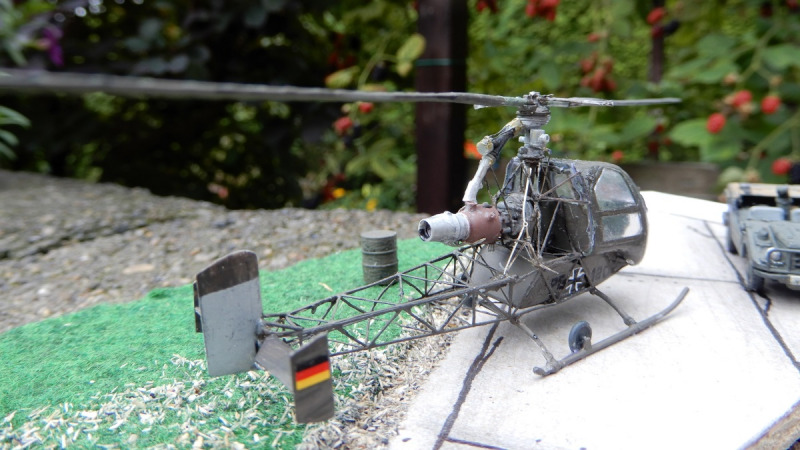 Eine große Hilfe beim Bau waren die Fotos, die ich im Museum in Bückeburg gemacht habe sowie die entsprechende Ausgabe der Heftserie F-40, welche auch die Quelle für alle Angaben ist. Einzig die Rotorblätter lagen als Plastik-Teile bei, der Rest war aus Resin und der Gitterrumpf war ein Ätzteil, das noch dreimal gefaltet werden mußte, um dann vorsichtig mit Sekundenkleber zum Halten gebracht zu werden. Nun hieß es nur nicht scharf angucken und sehr vorsichtig anfassen: Für das Leitwerk waren nur punktförmige Klebungen vorgesehen. Hier habe ich für die Höhenruder noch einen dünnen Draht durch den Gitterrumpf hinten gesteckt, angeklebt und die Ruder darauf befestigt.