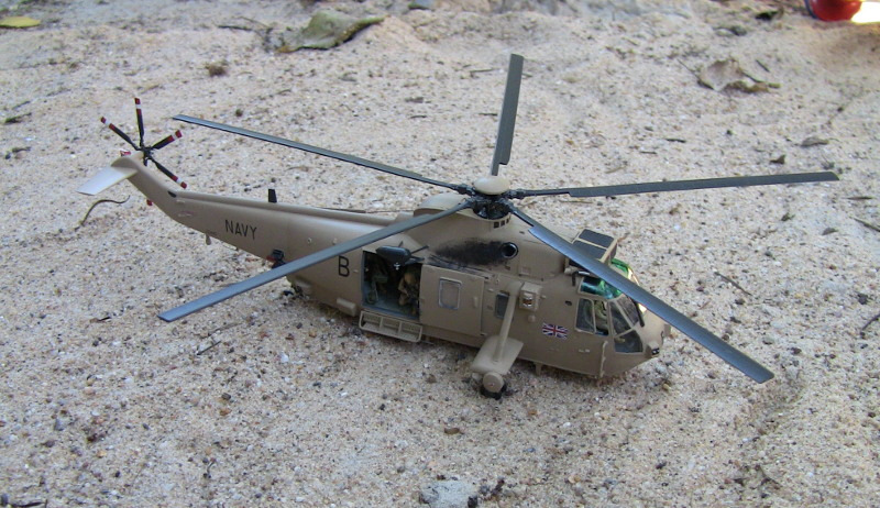 Lackiert habe ich den Sea King – wie zu sehen – in Wüstentarnung. Das Schema mit den großen britischen Identifikationsflaggen ist fiktional.