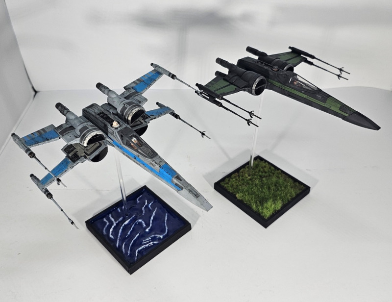 Nach dem Bau des ersten T-70 wollte ich auch einen mit geschlossenen Flügeln bauen. Ich hatte noch den Bandai-Bausatz von Poe Damerons X-Wing zuhause. Der ist in Schwarz und Orange. Da mir das Orange nicht so sehr gefallen hat, wurden die orangenen Flächen grün lackiert und der Sockel auch an die neue Farbe angepasst.