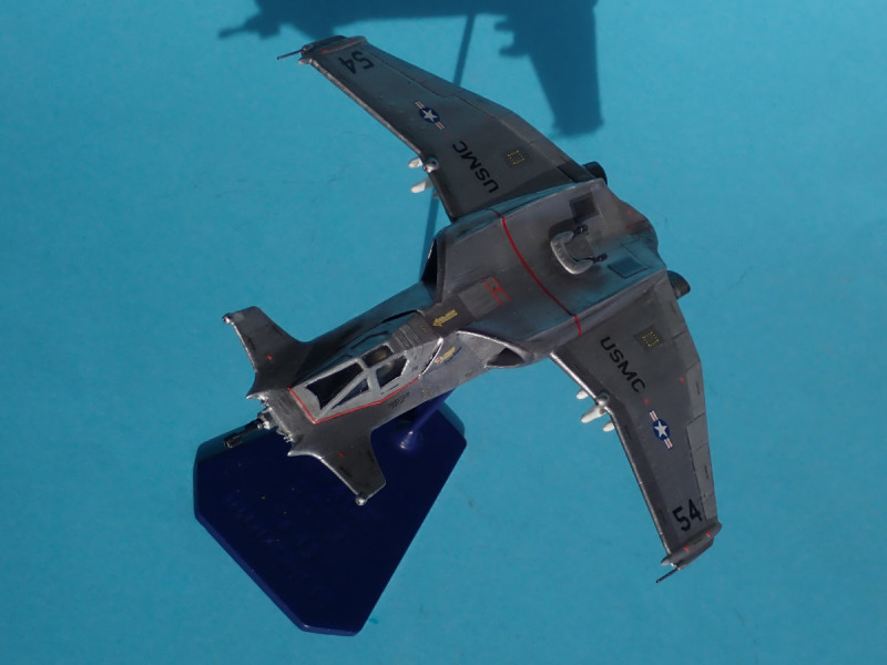 Lackiert habe ich den SciFi-Jäger mit dem Pinsel und Email-Farben von Revell. Hier hat man die Qual der Wahl: Will man einen silbernen Anstrich auftragen, oder doch lieber Hellgrau? Die in den Flugszenen gezeigten Hammerheads sahen silbern aus, das Mock-up war hellgrau angestrichen. Ich entschied mich fürs Metallische.