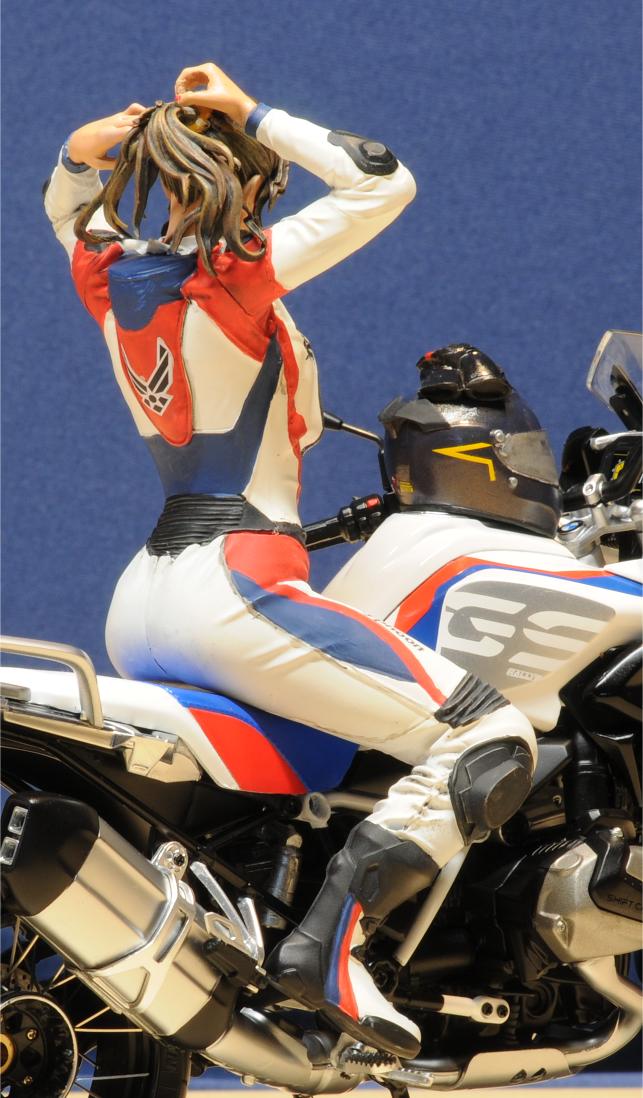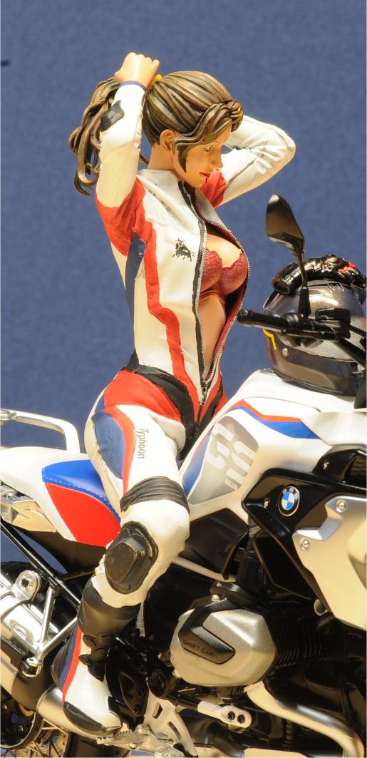 Die Figur ist hochdetailliert. Zu kleben ist sie ausschließlich mit Sekundenkleber, nur wenig Spachtelarbeiten sind notwendig. Die Dame richtet sich gerade die Haare, um den Helm aufzusetzen. Es muss heiß sein, sie hat den Lederkombi bis weit unter den Bauchnabel geöffnet und nur Dessous darunter… Der Figuren-Designer hat sehr gute Darstellungen der Faltengebung des Lederkombis gemacht. Wichtige Details wie Sturzpads an den exponierten Gelenken, Wirbelsäule und Schultern sind vorhanden. Knieschleifer sind an beiden Knien richtig positioniert. Sogar ein sehr sauberer Reißverschluss für die Einteiler-Kombi ist da. Die Stiefel verdienen den Namen auch. Auch hier sind sogar Schleifpads an den vorderen Außenkanten richtig positioniert. Etwas erotisch wird es mit dem BH der Dame - auch er ist hoch detailiert. Die Farbwahl ist jedem selbst überlassen. Aber selbst kleinste Details wie Spitzenverzierungen sind erkennbar. Hoffentlich wird bei der sorgfältigen Farbgestaltung dieses Bauabschnitts nicht die Lebensgefährtin eifersüchtig…